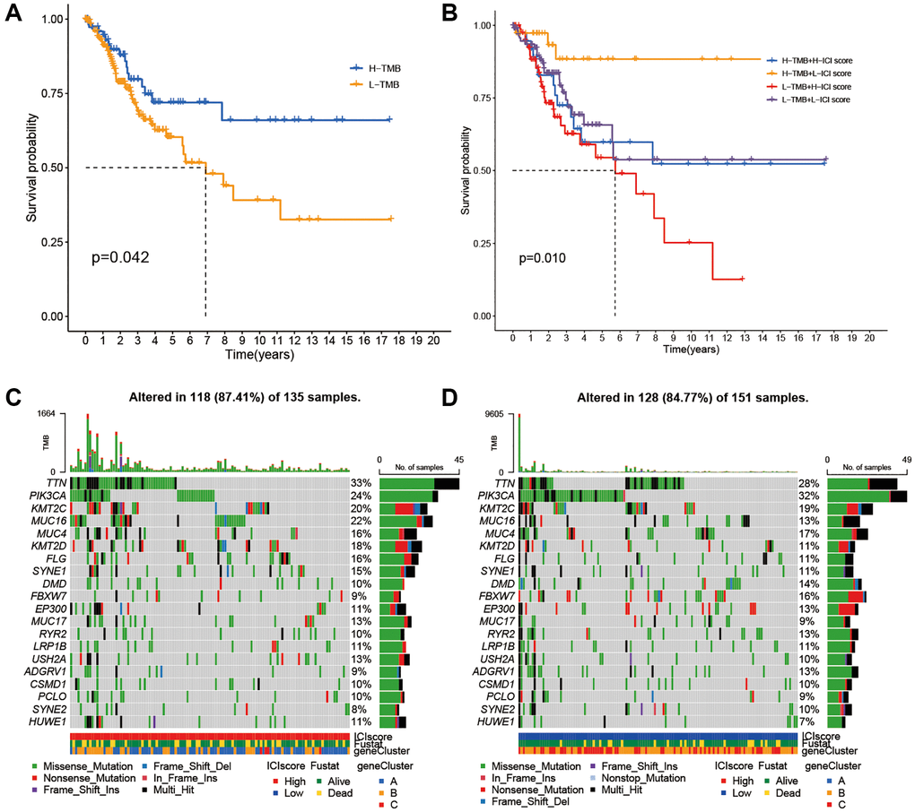 Next, we compared the distribution of CC driver genes derived by Maftools between the two ICI score groups [19]. The top 20 driver genes with the most frequent alterations were further analyzed (Figure 4C, 4D). Table 1 showed that alteration frequencies of KRAS, MED12, TP53, PKHD1L1, and SPTA1 were significantly different within two ICI score subgroups.