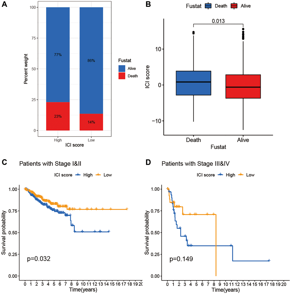 To assess potential clinical applications of ICI scores, we visualized distribution differences of survival status within two ICI score groups and found that patients who died had relative high ICI scores (Figure 5A, 5B). In addition, we performed survival analysis to evaluate prognostic implication of ICI score at different stages. Kaplan–Meier analysis showed that stages I and II patients with high ICI scores were correlated with worse prognosis than those with low scores. Furthermore, no significant difference was observed both in patients with high and low ICI scores at III and IV stages (Figure 5C, 5D).