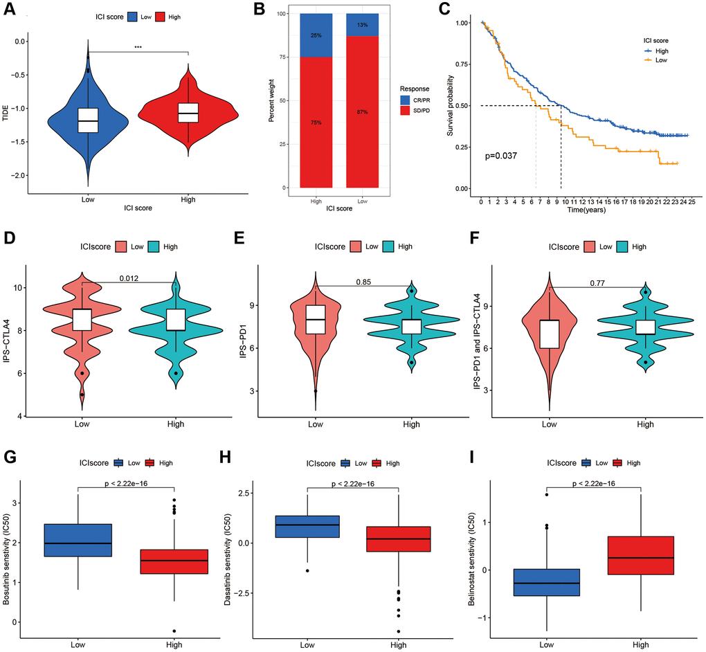 Immunotherapies by blocking T cell inhibition pathways (immune checkpoint blockade) had been widely applied to cancer treatment. To clarify responses to immunotherapy for different ICI score patients, we divided the IMvigor210 immunotherapy cohort patients, receiving the anti-PD-L1 intervention, into high or low ICI score groups using the ICI model. Patients with high ICI scores were observed higher response rates to anti-PD-L1 immunotherapy (Figure 7B) and better prognostic survivals (Figure 7C). Also, an additional TCIA database was used to further validate immunotherapy responses to PD1 and CTLA4 among individuals with different ICI scores. Figures 7D–7F displayed treatment responses to IPS, IPS-PD1, and IPS-CTLA4 in both ICI score group patients. Based on the pRRophetic method, we predicted the therapeutic sensitivity of TIs (Bosutinib, Dasatinib and Belinostat) between the two groups, and found two TIs (Bosutinib and Dasatinib) had higher IC50 in low score patients (Figure 7G, 7H). Individuals with low ICI scores were more sensitivity to Belinostat than those with high scores (Figure 7I).
