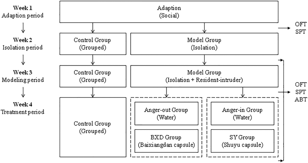 First, we established the rat model based on the widely recognized social isolation stress combined with the resident-intruder paradigm [47]. Wistar rats were used as residents, whereas SD rats as intruders. As shown in Figure 1, the experimental process was 4 weeks. All rats were fed adaptively (food and water ad libitum to suit the environment, 12 hours light/dark cycle for 1 week (lights on at 8:00 p.m., four rats per cage, with no manipulation except daily grasping). From the beginning of the second week, 12 Wistar rats were randomly selected as the control group with 4 per cage, and the remaining Wistar rats as the model group (AO group and AI group) with 1 per cage, and were maintained for 7 days. In the third week, rats in the model group were exposed to social isolation and resident-intruder stress every day. The SD rats were placed in the cage of the model group for 15 min. The resident was confronted with a different intruder each day based on the Latin Square design [49]. At the end of the third weekend, 48 rats in the model group were divided into the AO group (24 rats) and the AI group (24 rats) according to the comprehensive attack score of median analysis. Simultaneously, 12 rats from the AO group were randomly selected as the anger-out BXD group, and 12 rats from the AI group were randomly selected as the Anger-in SY group (12 rats in each group). In the fourth week, social isolation and resident-intruder stress still existed. Besides, rats in the BXD group were orally administered BXD suspension at a dose of 1.33 g/kg (equivalent to 8 times of clinical dose of humans) [21, 50], continuing for 7 days. Rats in the SY group were orally administered SY suspension with the same dosage and course of treatment. The control, AO, and AI groups were orally administered an equal volume of sterilized water and the same course of treatment. The sucrose preference test (SPT) and open field test (OFT) were conducted at the end of each week, and the aggressive behavior test (ABT) was conducted only at the end of the second, third, and fourth weeks.