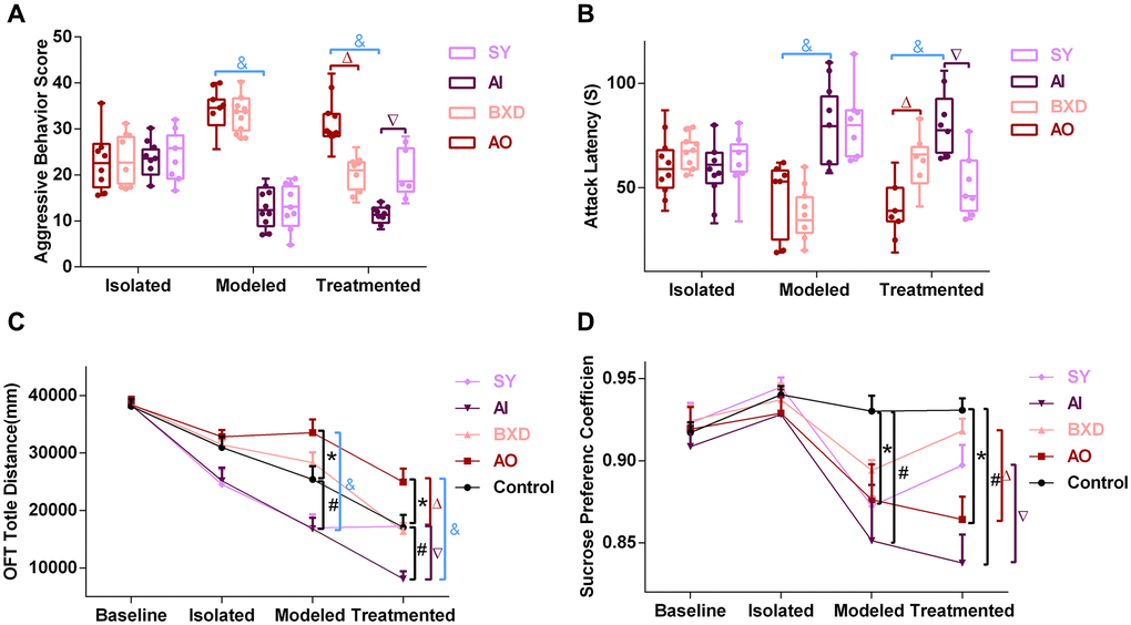 Aggressive behavior score (ABS) is the main indication of the AO and AI rat models. As shown in Figure 2, the difference in ABS, attack latency (AL), OFT total distance, and sucrose preference coefficient (SPC) between groups at baseline were not statistically significant (P > 0.05). After modeling, rats in the group were divided into the AO and AI groups according to ABS and AL (Figures 2A, 2B); compared with the control group, the OFT total distance of the AO group significantly increased, whereas that of the AI group significantly decreased (P < 0.05) (Figure 2C). The SPC values of both the AO and AI groups were significantly lower than those of the control group (P < 0.05) (Figure 2D). After the medication, compared with the AO group, ABS and OFT total distances of the BXD group were all significantly decreased and AL was significantly increased (P < 0.05). Compared with the AI group, ABS and OFT total distances of the SY group were all significantly increased (P < 0.05), and AL was significantly decreased (P < 0.05). The SPC values of the BXD and SY groups were significantly increased (P < 0.05) and returned to the level of the control group. Moreover, a significant difference was observed between the AO and AI groups (P < 0.05).