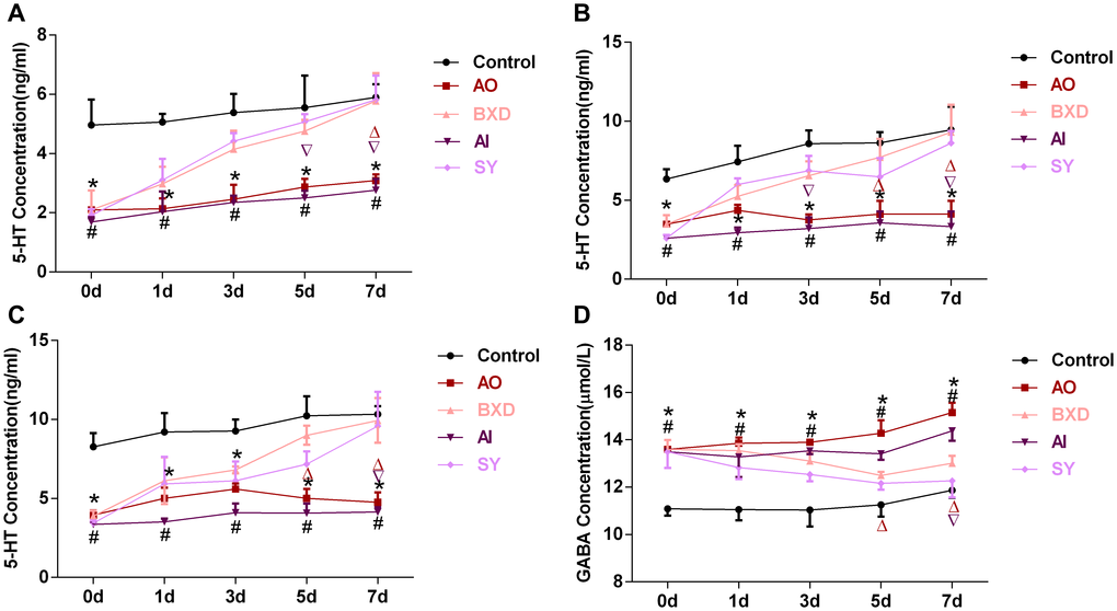 As the model group received no drug intervention, the level of 5-HT in the PFC, hypothalamus, and hippocampus of the AO and AI groups was significantly lower than that of the control group (P < 0.05). By contrast, the GABA level in the DRN of the AO and AI groups was higher than that of the control group (P < 0.05). After the drug intervention, with the increase of the medication duration, the 5-HT levels in the PFC, hypothalamus, and hippocampus of the BXD and SY groups increased (P < 0.05), gradually corrected their abnormal decline, and returned to the normal level on the 7th day (Figures 3A–3C and 4A–4C). By contrast, the GABA level in the DRN decreased with the increase in medication duration (P < 0.05), gradually corrected its abnormal increase, and returned to normal level on the 7th day (Figures 3D, 4D).