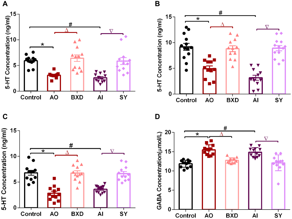 The release of 5-HT from 5-HT neurons in the DRN was significantly decreased in AO and AI rats, as were the levels of 5-HT projected to the PFC, hypothalamus, and hippocampus via fibers. BXD could relieve AO and SY could relieve AI by treating the aforementioned abnormalities.