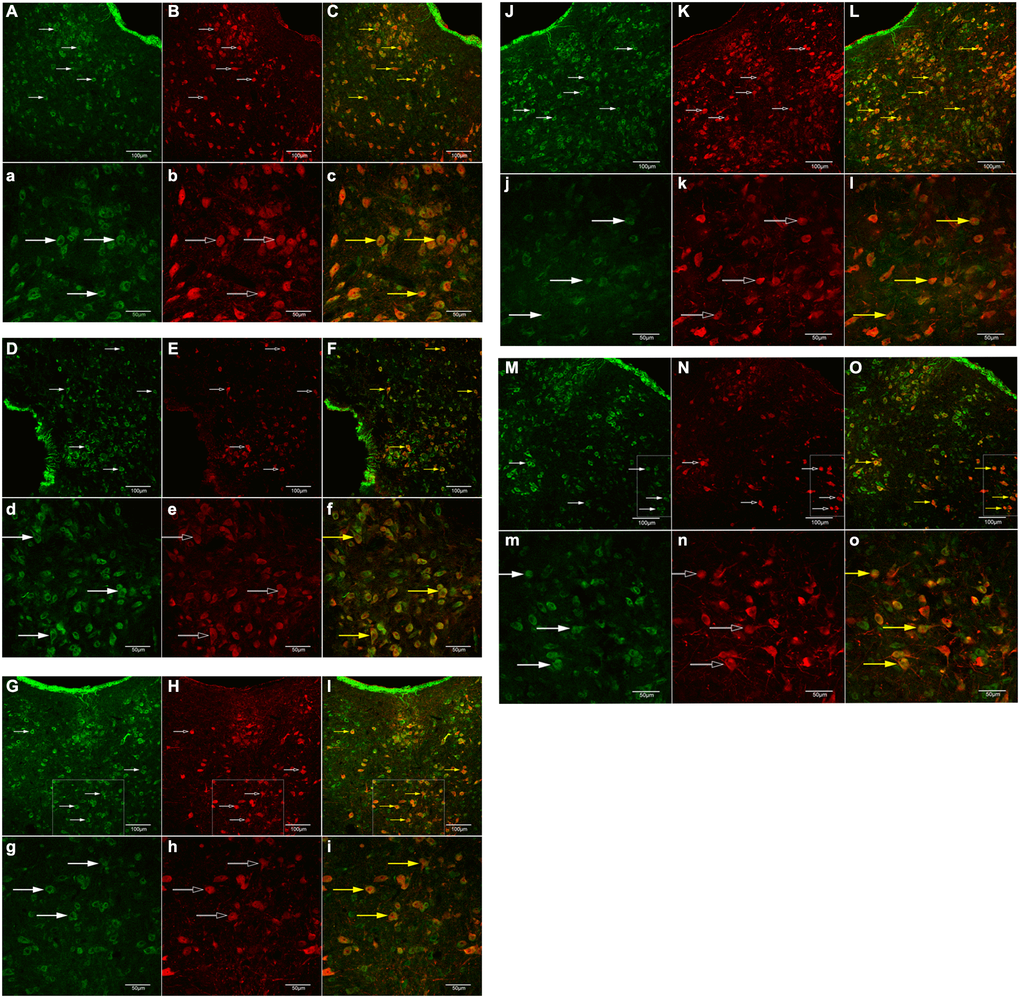 Previous studies have demonstrated that 5-HT neurons in the DRN have nerve fiber connections with the PFC, hypothalamus, and hippocampus [37]. Consequently, the expression and nerve connection of 5-HT neurons and GB1 in the DRN, as well as the nerve fiber connection of BXD (regulates AO) and SY (regulates AI). As shown in Figure 5, 5-HT immunostaining positive cells (red) (5-HT neurons) in the DRN of each rat group exhibited GB1 immunostaining positive cells (green). Thus, 5-HT and GB1 are co-expressed in the DRN and have a nerve fiber connection. To clarify the neuromorphological basis of BXD and SY in the treatment of AO and AI.