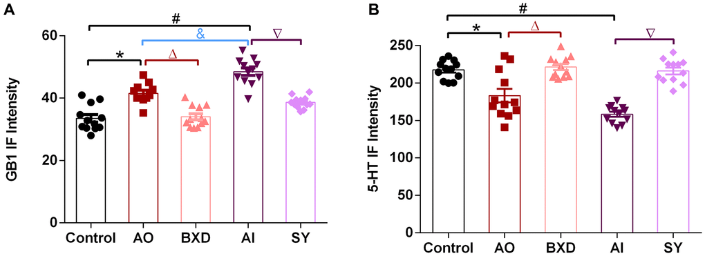 We performed a semi-quantitative analysis of immunofluorescence intensity. The results demonstrated that intensity in both model groups decreased significantly more than that in the control group (P < 0.05). Besides, after the drug intervention, 5-HT content in the DRN was elevated to normal levels in the BXD and SY groups (P < 0.05) (Figure 6A). However, the intensity in both model groups was increased significantly more than that in the control group (P < 0.05). Besides, the AI group increased significantly more than the AO group (P < 0.05). After the drug intervention, GB1 content in the DRN was decreased to normal levels in the BXD and SY groups (P < 0.05) (Figure 6B).