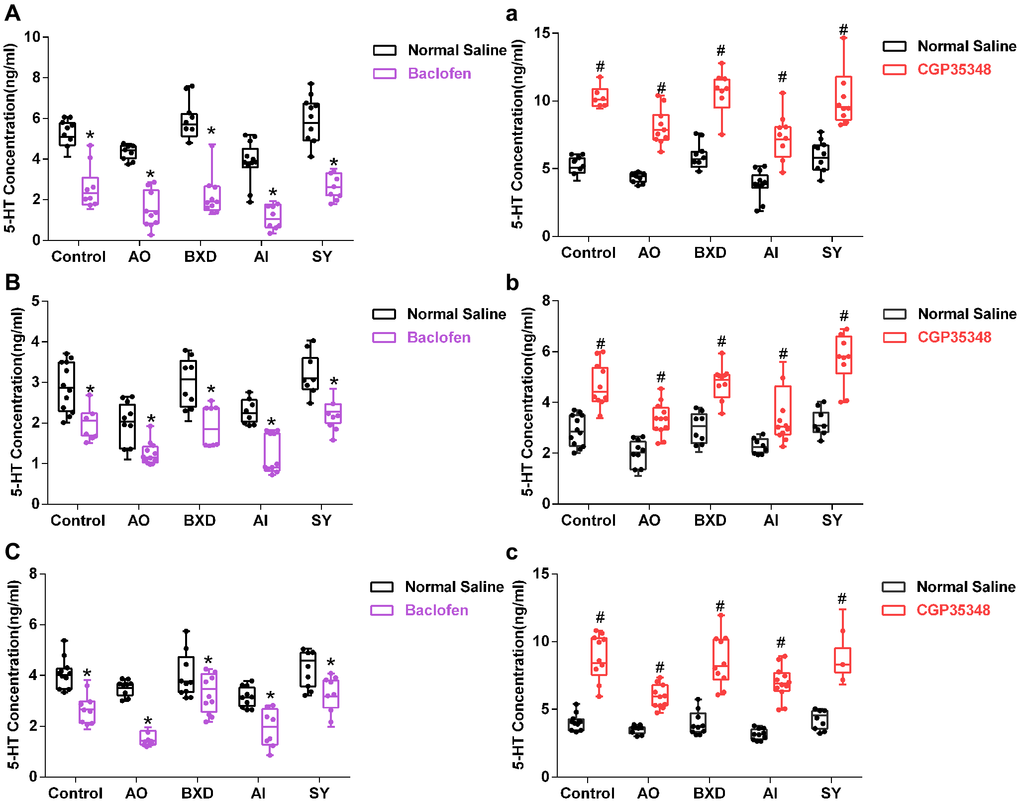 In conclusion, BXD and SY can act on GB1 in the DRN, and then affect the effect of GABA, thus affecting the levels of 5-HT in the PFC, hypothalamus, and hippocampus of AO and AI rats. Thus, GB1 in the DRN mediates GABA regulation of 5-HT levels in the PFC, hypothalamus, and hippocampus, which is the target of BXD in regulating AO and SY in regulating AI. However, some scholars [101] have found that the extracellular 5-HT content of the medial prefrontal cortex increased after microinjection of baclofen into the DRN, which may be because the total content of 5-HT in and out of the cells in the prefrontal region was not synchronized with the change in extracellular 5-HT content. Furthermore, baclofen injection into the DRN at night can decrease the level of 5-HT in the DRN [100], whereas daytime injection can increase the level of 5-HT in the DRN [102]. Therefore, different injection times of baclofen may lead to the opposite expression of 5-HT.