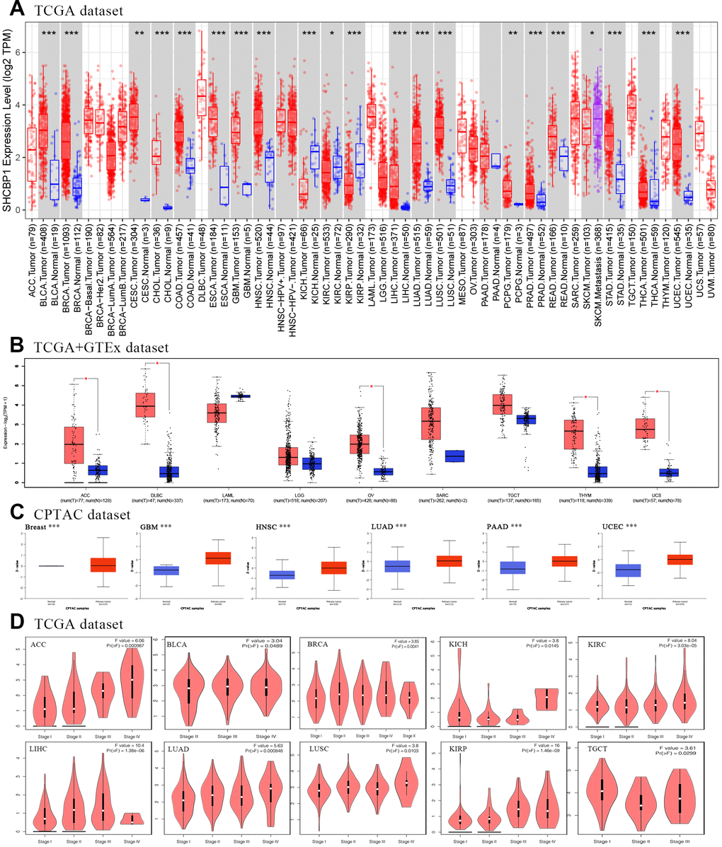 We assessed SHCBP1 expression in tumors and normal tissues using the TIMER2 database with the following thresholds: P≤0.01, log2|fold change| (FC) = 1. (http://gepia2.cancer-pku.cn/#analysis) [15]. The GEPIA2 database was used to further investigate SHCBP1 expression in relation to prognosis and clinical stage, with “Pathological Stage Plot” and “Expression analysisBoxPlot” modules [16]. For survival, violin and box plots were used to visualize any significant differences. The total protein expression was obtained from the CPTAC of the UALCAN database (http://ualcan.path.uab.edu/analysis-prot.html) [17].