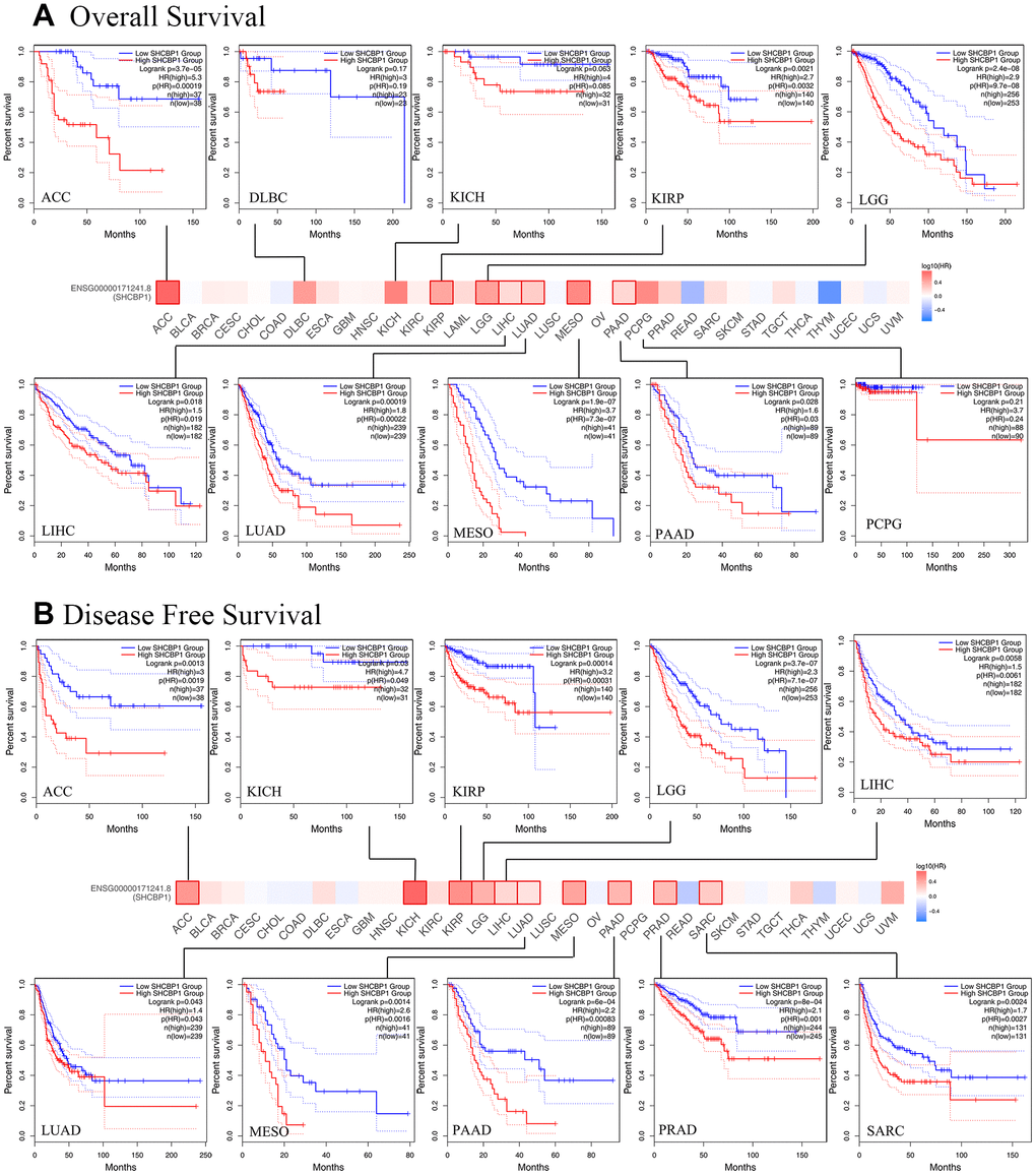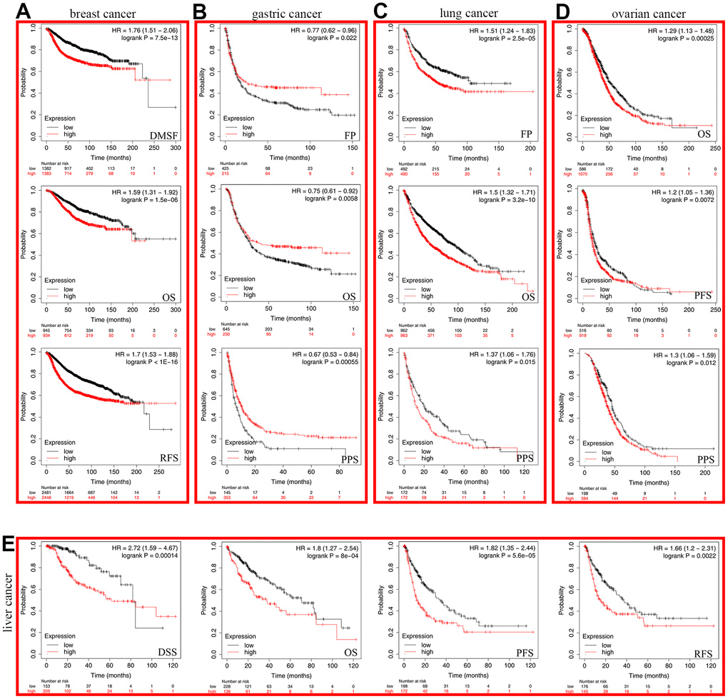 The overall survival (OS) and disease-free survival (DFS) in the GEPIA2 database were applied to evaluate the prognostic value of SHCBP1 in different cancers. The survival map was obtained using the threshold 95% confidence intervals. The first progression (FP), disease-specific survival, post-progression survival (PPS), progression-free survival (PFS), and relapse-free survival (RFS) correlations were assessed in Kaplan–Meier plotter to determine the prognostic value in breast, lung, ovarian, GC, and liver cancer with the threshold value as: “auto select best cutoff” and log-rank P values [18].