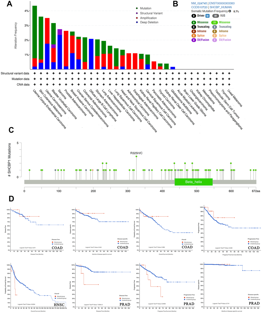 The SHCBP1 gene is located in a region of chromosome 16q11.2 [29]. In the cBioPortal database, there are several reported alterations of SHCBP1 in pan-cancers, with the most prominent types being “mutation” and “amplification.” We identified that prognosis in the unaltered group was better than that in the altered group. As a key binding protein of cell surface receptors, mutation and amplification of SHCBP1 may lead to abnormal binding of SHC proteins, resulting in physiological and metabolic dysfunction. Importantly, detecting SHCBP1 gene mutations will be valuable for improved prognosis and targeted therapy efficacy.