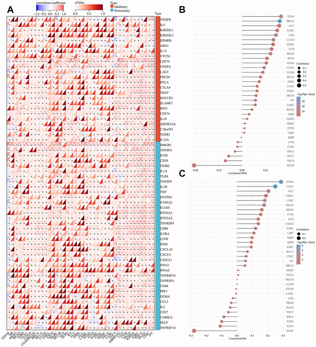 We further estimated the role of SHCBP1 expression in modulating immune checkpoints. There were 24 immune inhibitors and 36 activators investigated across the various cancers. The expression of SHCBP1 was positively correlated with the expression of four inhibitors (KIR2DL3, IL13, PDCD1, and CD274) and five activators (HMGB1, ICOS, BTN3A1, BTN3A2, and PRF1) in the majority of tumors. However, in THYM, SHCBP1 expression was negatively correlated with the expression of all studied immune checkpoints except for KIR2DL3, EDNRB, ARG1, IL13, VTCN1, BTLA, IDO1, CD274, IL1O, TGFB1, IL1A, BTN3A1, IFNA2, PRF1, IL2, SELP, and TNFRSF14. CD276, VEGFA, TNFRSF9, TNFSF4, and HMGB1 play important immune roles in various tumors (Figure 5A). Gene mutations are an important inducing factor in tumorigenesis [24]. TMB and MSI can cause polymorphisms in immunogenic peptides and microsatellite sequence length, respectively, leading to genomic instability [25]. The results revealed that TMB was positively associated with SHCBP1 expression in 18 types of cancers while negatively correlated in THYM and ESCA (Figure 5B). There is also likely a close correlation between SHCBP1 expression and MSI in UCEC, STAD, LUSC, COAD, READ, and LIHC (Figure 5C).