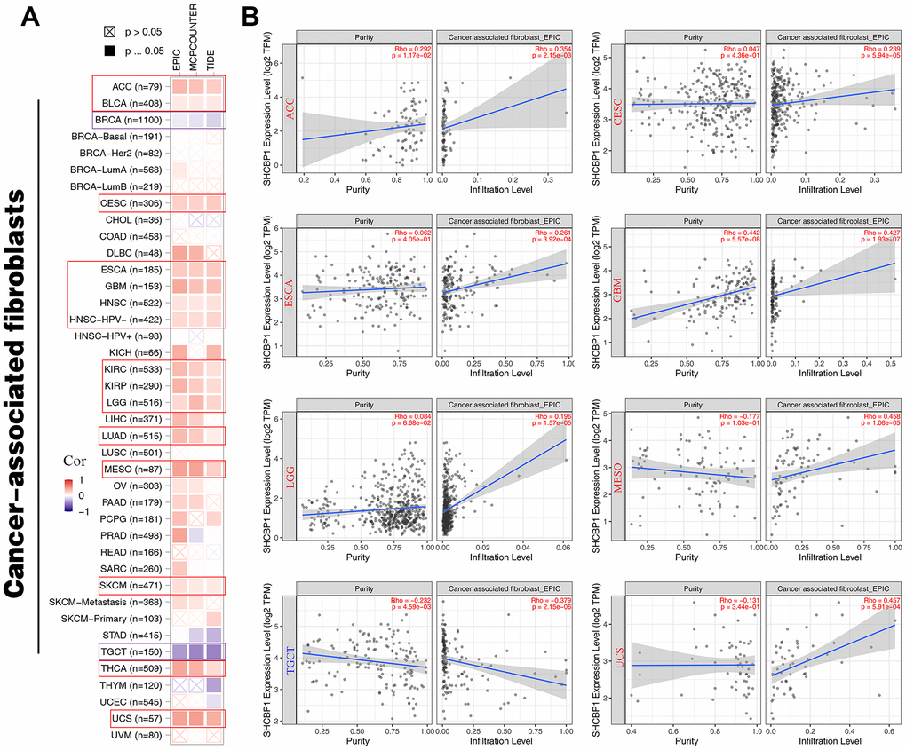 Spearman correlation analyses were used to calculate the correlations of SHCBP1 expression in pan-cancers with tumor mutational burden (TMB) score, microsatellite instability (MSI), and two immune checkpoint pathway genes (inhibitory, stimulatory), with the results presented in bubble charts [20]. To further determine the relationship between SHHCBP1 and tumor immune, immune infiltration was analyzed using the CIBORSORT and XCELL algorithms. In addition, we also investigated the number of cancer-associated fibroblasts using the EPIC, MCPCOUNTER, and TIDE algorithms; the results are shown in a heatmap and scatter plot [21, 22].