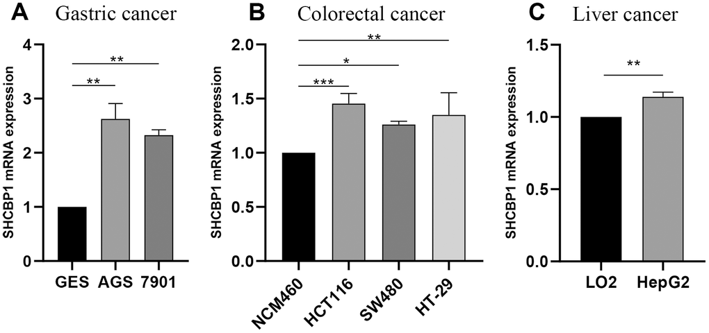 To validate the above results, we detected the expression of SHCBP1 in GC, CRC, and HCC cell lines. The experimental results indicated that SHCBP1 expression was upregulated in GC (AGS and 7901 cell lines), CRC (SW480 and HCT116 cell lines), HCC (HepG2 cell line) cells compared to their corresponding control groups (Figure 9A–9C).