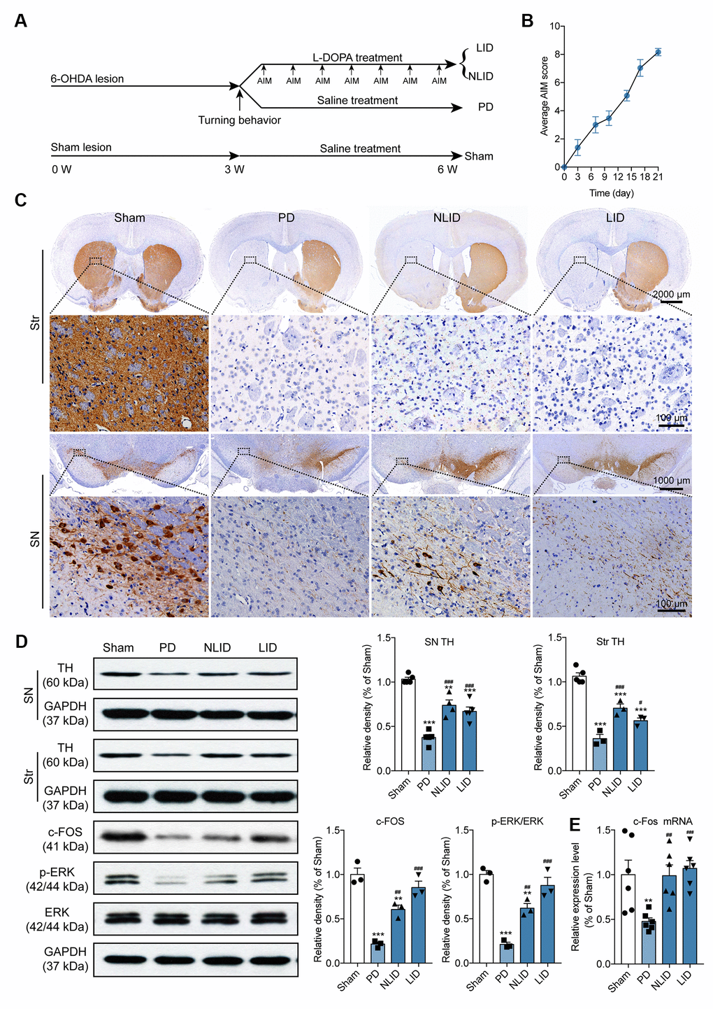 Validation of the rat model of PD and LID. (A) Experimental timeline showing 6-OHDA lesioning, l-DOPA administration, behavioral testing, and animal grouping. (B) Time course of the manifestation of AIMs scored every 3 days over a period of 21 days after the final l-DOPA administration (n = 15). (C) Representative photomicrographs of TH immunohistochemical staining in coronal brain sections of the striatum and SN of rats subjected to 6-OHDA injection into the right striatum (PD) with (LID) or without (NLID) l-DOPA administration. Magnified images correspond to labeled boxes in the upper panels (n = 3). (D) Quantification of TH expression in the striatum and SN and of c-FOS, p-ERK, and ERK expression in the striatum of PD and LID rats and their corresponding control groups (n = 3–5). The signal intensity of protein bands was normalized to that of GAPDH. (E) qRT-PCR detection of c-Fos expression in the striatum of PD and LID rats and their corresponding controls. Data are shown as mean ± SEM (n = 6). **P < 0.01, ***P < 0.001 vs. sham group; #P < 0.05, ##P < 0.01, ###P < 0.001 vs. PD group.