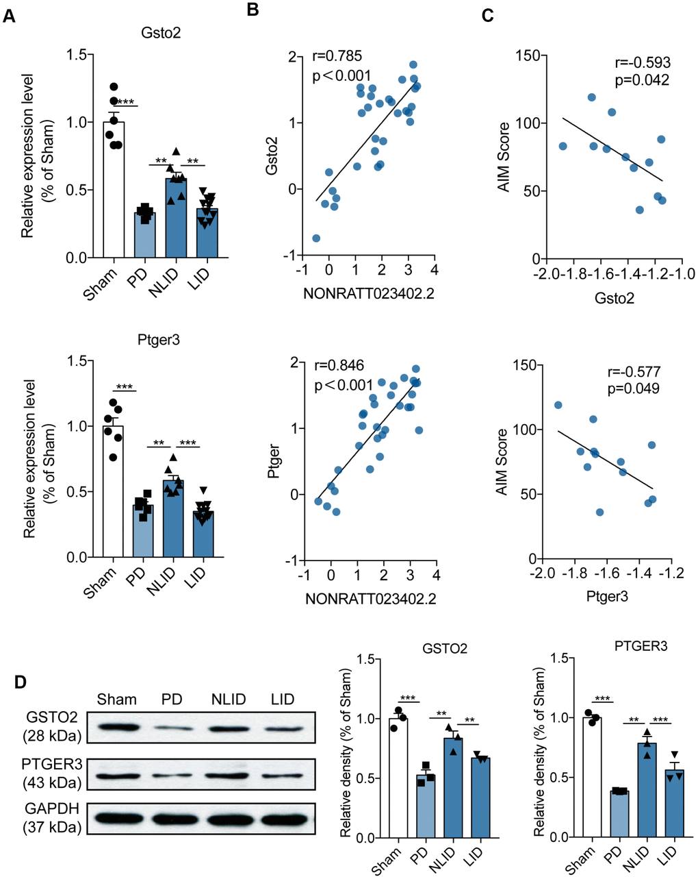 (C) Correlation between Gsto2 or Ptger3 expression in the striatum of LID rats and AIM score (n = 11). (D). GSTO2 and PTGER3 protein levels in the striatum of PD and LID rats and their corresponding controls (n = 3), as determined by western blotting. The intensity of protein bands was quantified by densitometry and normalized to that of GAPDH. The same GAPDH image was used intentionally in Figure 1D and Figure 4D as the internal control of the same Western blot. Data represent mean ± SEM. **P < 0.01, ***P < 0.001.