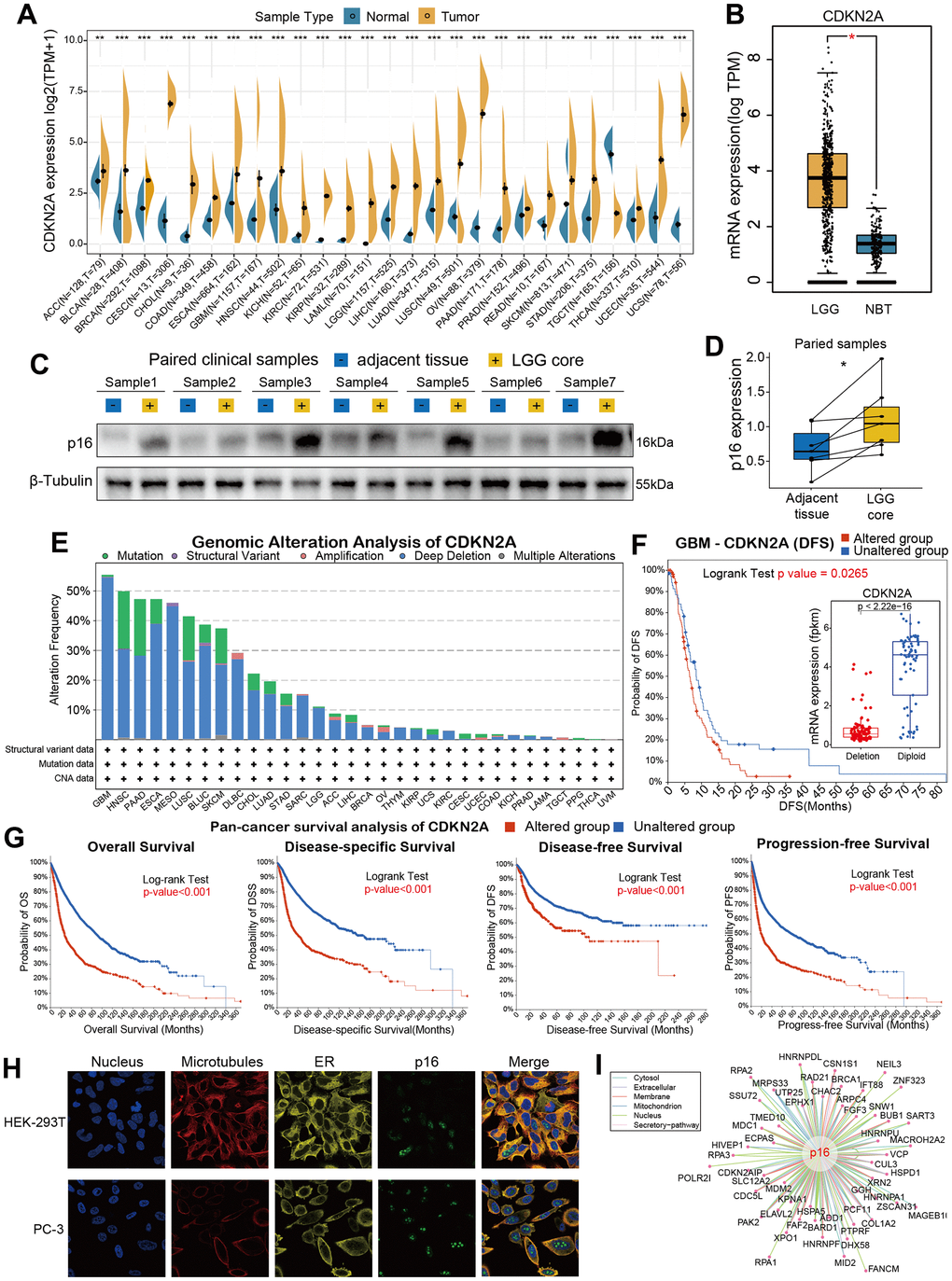 In order to analyze the fundamental information of CDKN2A in cancers, we used the transcriptomic data obtained from TCGA and GTEx databases to assess the mRNA expression levels of CDKN2A in cancers compared with human normal tissues. Almost all of TCGA cancers have a higher expression level of CDKN2A than normal tissues, including ACC, BLCA, GBM, HNSC, KICH, KIRC, KIRP, LAML, LGG, LIHC, LUAD, LUSC, OV, PAA, BRCA, CESC, CHOL, COAD, ESCA, PRAD, READ, SKCM, STAD, THCA, UCEC, UCS. It. While, only TGCT has a lower CDKN2A expression than normal tissues (Figure 1A). Besides, the expression of CDKN2A in normal human samples (Supplementary Figure 1A) and cancer cell lines (Supplementary Figure 1B) were also presented in our study. Particularly, we found the mRNA expression of CDKN2A in LGG is significantly increased (Figure 1B) compared with normal brain tissues, which caught our interests. To verify whether aberrant protein expression of p16 exists in LGG, we performed western blot assay to detect the protein of p16 in seven pairs of LGG samples with related adjacent tissues (Figure 1C, original data were shown in Supplementary Figure 2), and quantitative results showed that the expression of p16 is upregulated in LGG cores compared with adjacent tissues (Figure 1D). Then we conducted genomic alteration analysis of CDKN2A and found the alterations frequency of CDKN2A across pan-cancer are generally high (Figure 1E), alteration frequencies of 14 cancers are more than 10%. More interestingly, deep deletion frequency of CDKN2A is most high in most instances. The high deletion frequency of CDKN2A has been shown to be associated with a variety of tumors such as melanoma, lung cancer, head and neck cancer, pancreatic cancer, breast cancer, osteosarcoma, ovarian cancer [25]. In particular, the most frequently altered cancer type was GBM, exceeding 50% GBM patients and deep deletion is the highest frequent alteration (Figure 1F). Then we conducted pan-cancer survival analysis of CDKN2A and we found that the OS, DSS, DFS, PFS time of the CDKN2A altered group are all shorter than unaltered group (Figure 1G, all the four p-value <0.001, log-rank test). Moreover, immunofluorescence (IF) images showed that CDKN2A protein was mainly distributed in the nucleus of HEK-239T and PC-3 cell lines (Figure 1H, original data were shown in Supplementary Figure 3). Lastly, we established the protein-protein interaction (PPI) network by exploiting the interaction data acquired from the ComPPI website. The network shows that the subcellular localizations information of protein p16 were mainly distributed in extracellular, secretory pathway, cytosol, mitochondria, nucleus and membrane subcellularly (Figure 1I), and interactor proteins were shown as depicts. To illustrate the expression distribution of CDKN2A in tumor microenvironment, we also visualized the expression of CDKN2A in different cells using the TISCH webtool (Supplementary Figure 4). The results showed that CDKN2A was mainly expressed in the malignant cells in tumor microenvironment, which indicated the important role of p16 in cancer cells.