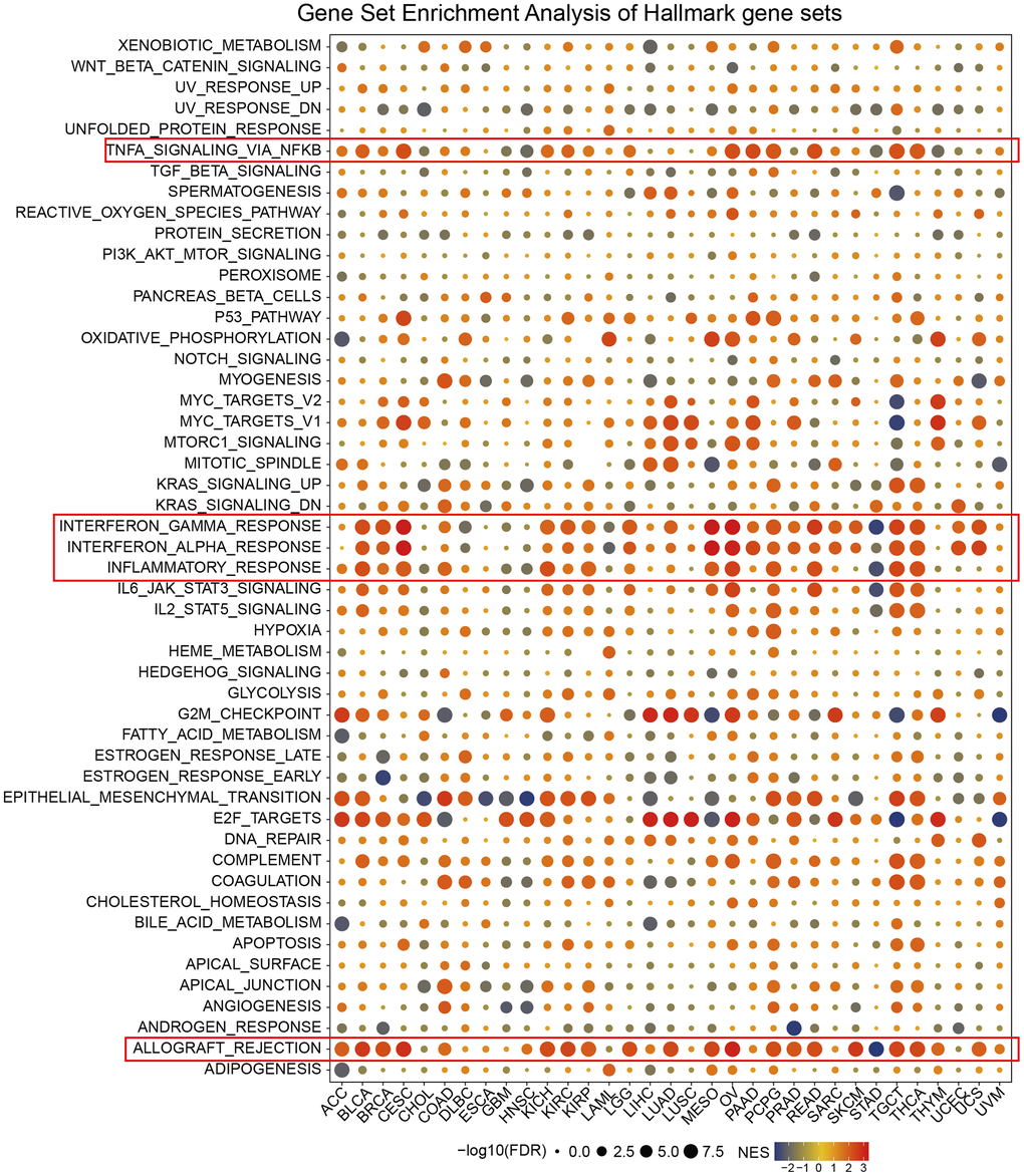 We downloaded the “gmt” file of hallmark gene set from Molecular Signatures Database (MSigDB, https://www.gsea-msigdb.org/gsea/index.jsp) [18] and computed false discovery rate (FDR) and the normalized enrichment score (NES) between low- and high-CDKN2A cancer group about their biological process in every cancer type. The GSEA was investigated by the R package “clusterProfiler” [19] and its results were detected in the bubble chart described by R package “ggplot2”.