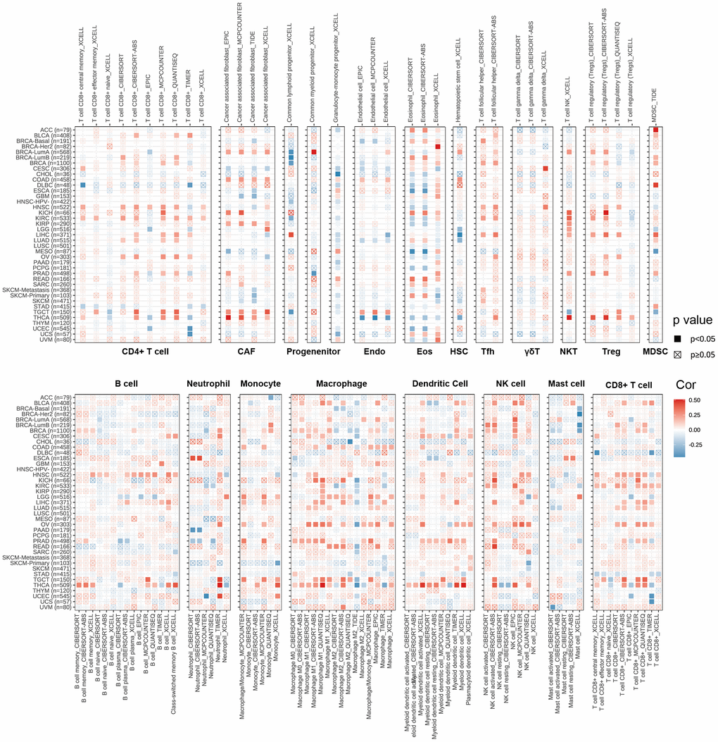 CD4+T cells, CAF, MDSC, neutrophils and macrophages have been shown to play key roles in tumor immunotherapy [30, 31]. The immune cells are a part of the tumor microenvironment, such as T cells, Tregs, B cells, MDSCs, NK cells, DCs [32]. We used the pan-cancerous immunocyte infiltration data from the TIMER2 database for Spearman correlation analysis to mine the correlations between CDKN2A expression and immunocyte infiltrations to further analyze the relationship between CDKN2A expression and tumor immunity. The results showed the correlations between CDKN2A expression and different infiltration levels of CD4+ T cells, CAF, progenitors, NK T cells, Tregs, B cells, Endo, Eos, HSC, Tfh, γ/δT, neutrophils, monocytes, macrophages, dendritic cells, NK cells, Mast cells and CD8+ T cells in pan-cancer (Figure 4). We uncovered that CDKN2A was positively correlated with infiltration degree of CD4+ T cells, NKT cells, Tregs, MDSC, neutrophils and macrophages in most TCGA cancers. Besides, we also uncovered that CDKN2A was negatively correlated with infiltration degree of CAF, progenitors, Endo and Eos. From another point of view, CDKN2A is positively correlated with the level of infiltration of most immunocytes such as B cell, NK cell, Mast cell, CD8+ cell, Dendritic cell, neutrophils, monocytes and macrophages in the TGCT and THCA. Our research results indicate that CDKN2A may affect the occurrence, prognosis and treatment of tumors by associating to immune cells.