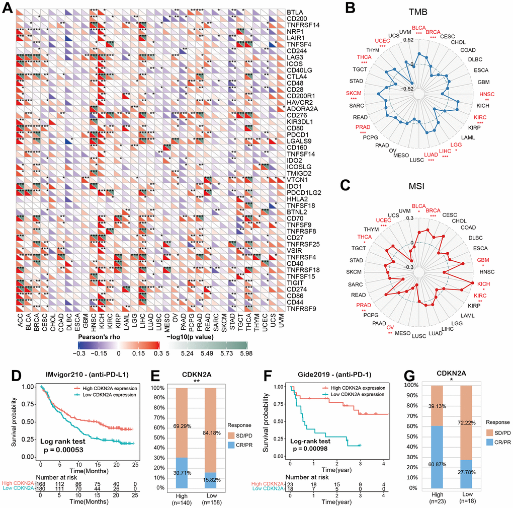 We used spearman correlation analysis to demonstrate the statistical correlation between CDKN2A and some immunotherapeutic biomarkers such as microsatellite instability (MSI), tumor mutation burden (TMB), and other immune checkpoint genes in pan-cancer. We obtained two treatment cohorts with immune checkpoint blockade (ICB) to analyze the predictive power of CDKN2A for immunotherapy response, the IMvigor210-urological cohort [20] and GSE9061-melanoma cohort.