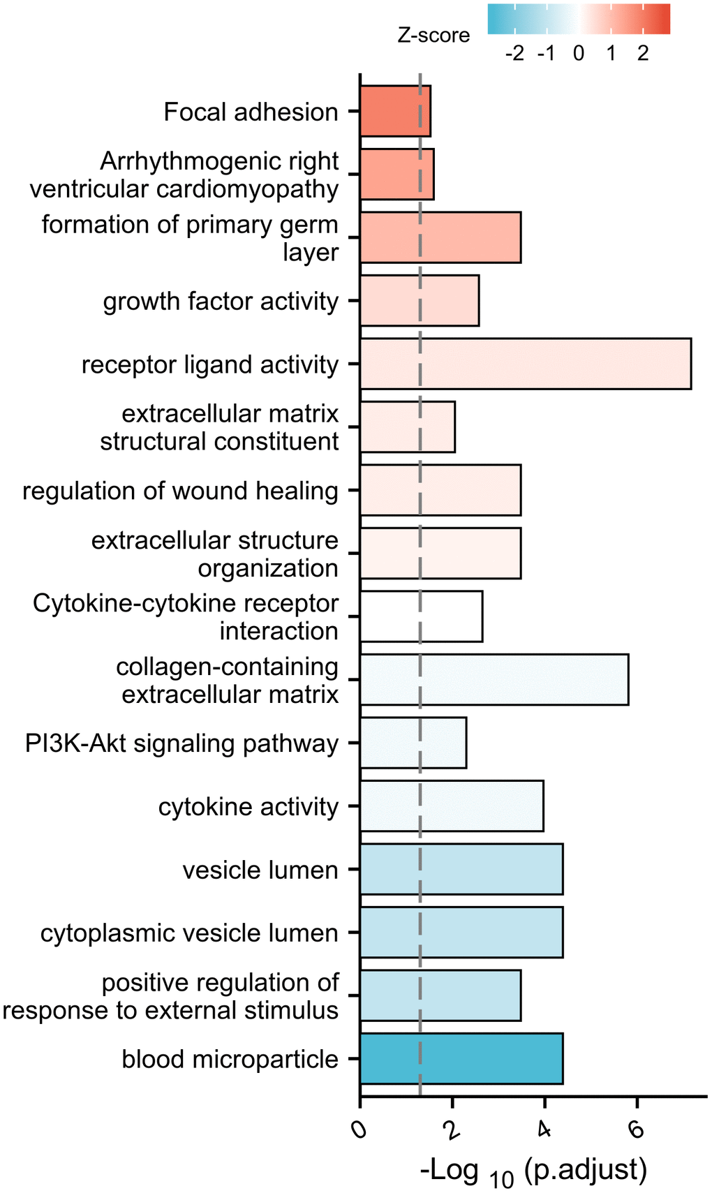 Xiantao software is an independent software tool mainly used for gene and protein function enrichment and interaction network analysis. GO and KEGG analysis showed that DEGs had the most uniquely enriched terms for blood microparticle, positive regulation of response to external stimulus, cytoplasmic vesicle lumen, vesicle lumen, cytokine activity, PI3K-Akt signaling pathway, collagen-containing extracellular matrix, Cytokine-cytokine receptor interaction, extracellular structure organization, regulation of wound healing, extracellular matrix structural constituent, receptor ligand activity, growth factor activity, formation of primary germ layer, Arrhythmogenic right ventricular cardiomyopathy, and Focal adhesion (Figure 2).