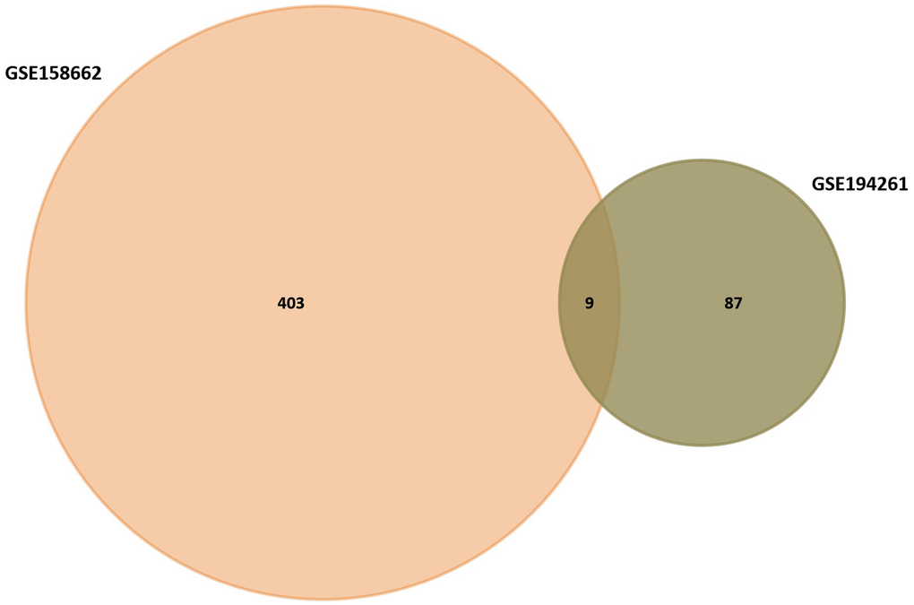 R software was used to analyze the DEGs from the GSE158662 and GSE194261. After screening, 412 DEGs such as STYK1, LINC00488, IFNA22P, FEZF1, NR4A1, and C15orf34 were obtained from GSE158662. By the same method, 96 DEGs such as PCOLCE2, SHISA3, SPECC1, IL13RA2, SAMD14, and SAA1 were obtained from GSE194261 (Figure 1).