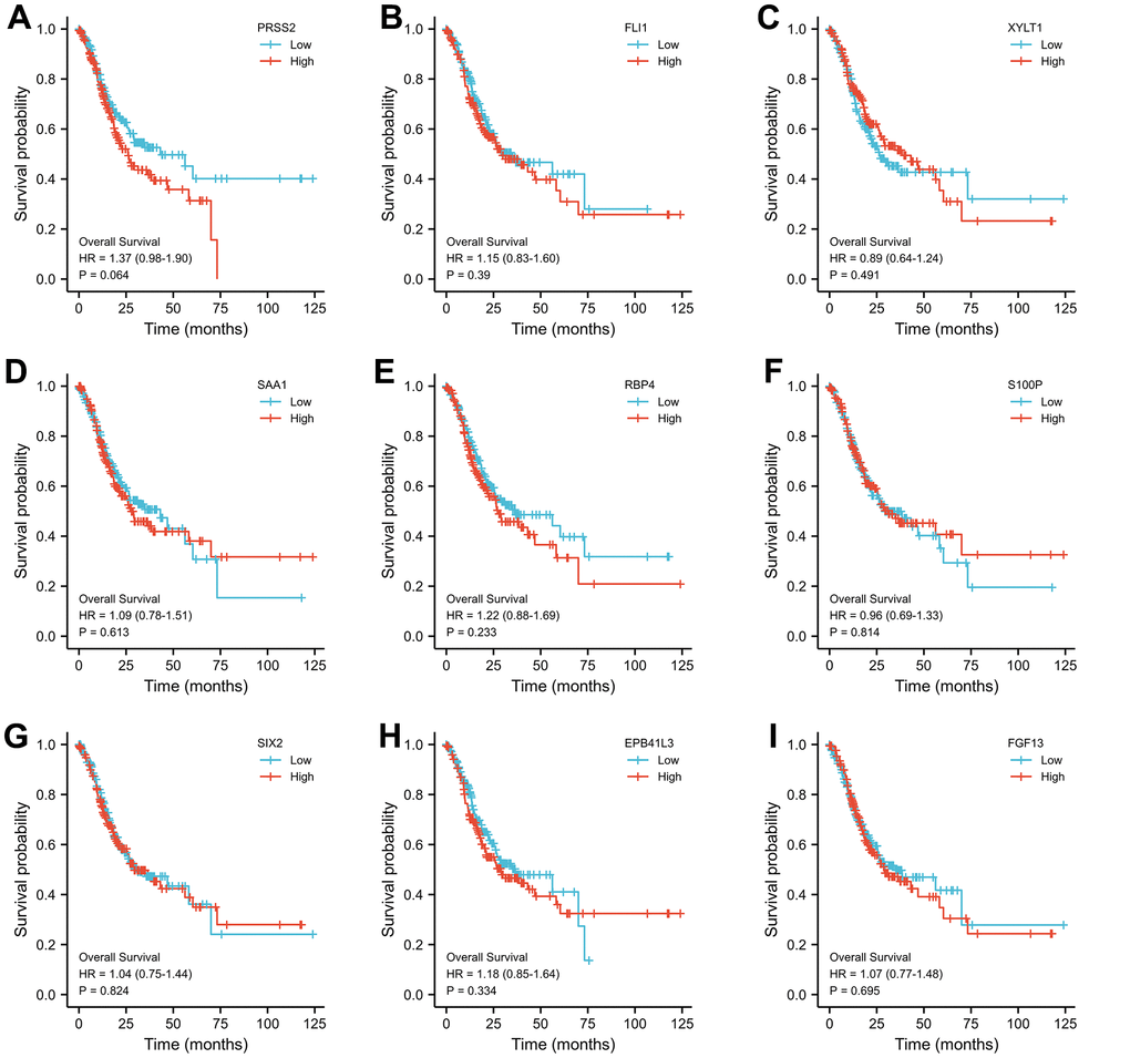 Through Venn diagram, 9 common differentially expressed genes were selected for further study (Figure 3). The prognostic value of the 9 common differentially expressed genes was evaluated through the KaplanMeier plotter database. The results showed that PRSS2 were related to gastric cancer OS (Figure 4). Therefore, we chose PRSS2 for further study.