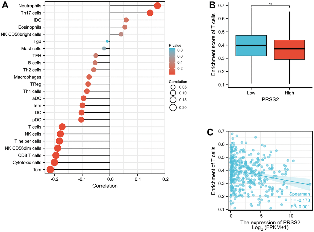 Immune infiltration analysis is to use transcriptome or other histologic data to estimate the score of immune cells in the tissue through algorithms. It can be used to analyze whether the immune cell scores of each sample in the high and low expression groups of a single molecule are statistically different. By utilizing Xiantao software, we found that PRSS2 was mostly related to Neutrophils, Th17 cells, Cytotoxic cells, and Tcm. High expression of PRSS2 in gastric cancer is associated with less T cell infiltration (Figure 5).