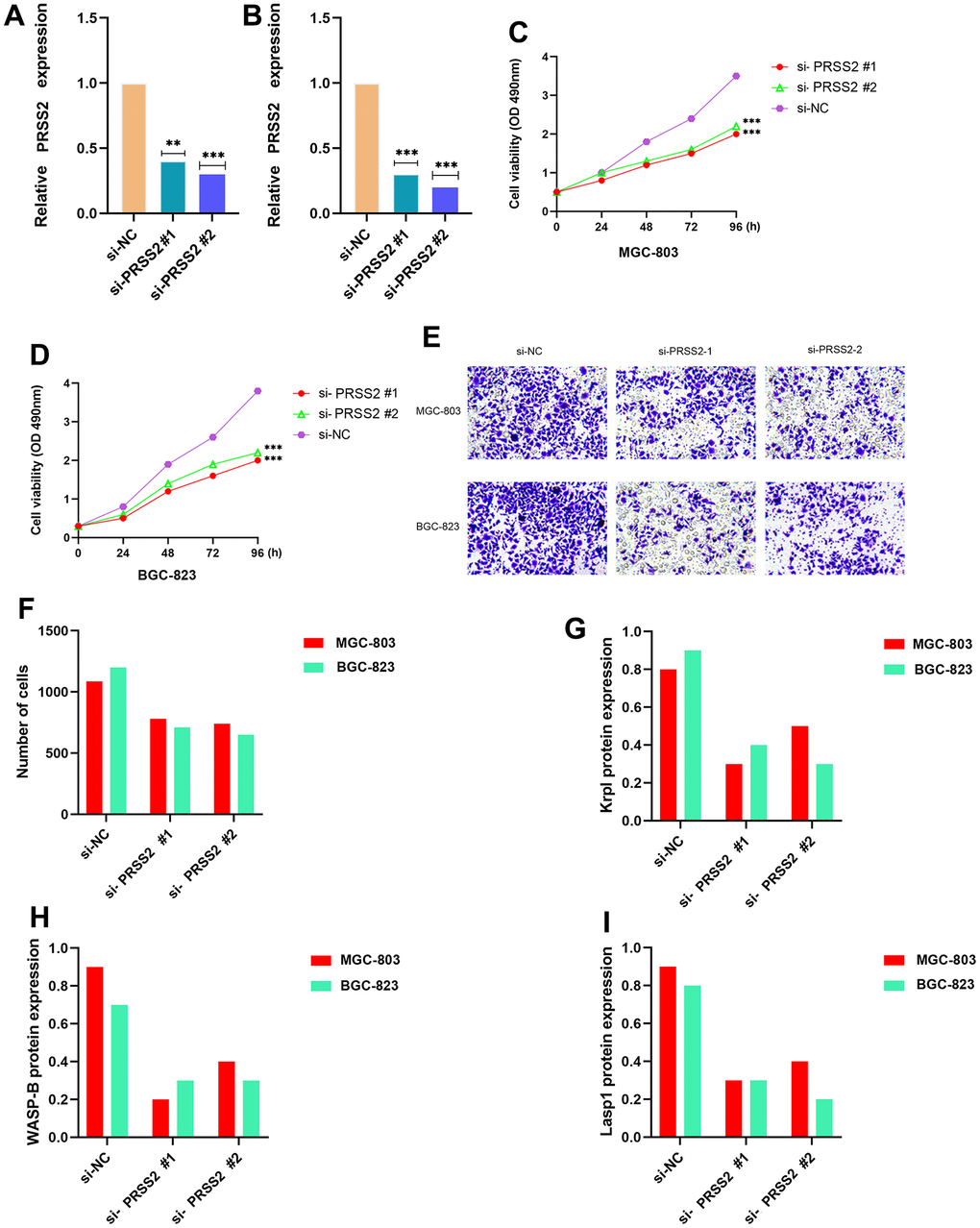 To investigate the potential biological function of PRSS2 in GC cells, we down-regulated the expression of PRSS2 in MGC-803 and BGC-823 cells by transfecting two independent siRNAs (#1 and #2, respectively). Both siRNAs significantly reduced the expression of PRSS2 (Figure 6A, 6B). The results of CCK-8 assay showed that the proliferation ability of MGC-803 and BGC-823 cells decreased after down-regulation of PRSS2 (Figure 6C, 6D). Through Transwell experiments, we further confirmed that silencing of PRSS2 inhibited the invasion ability of MGC-803 and BGC-823 cells (Figure 6E, 6F). PRSS2 knockdown also obviously suppressed the activity of invasive pseudopod-related proteins Krp1, WASP-B, and Lasp1 (P < 0.001) (Figure 6G–6I).