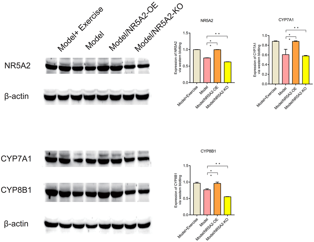 Forty 3-week-old C57BL/6J male mice were used in this study. The mean body weight was (17.5 ± 2.1) g. After 10 days of adaptive feeding, they were randomly divided into 4 groups according to the random number table method: Model + Exercise (n = 10), Model (n = 10), Model/NR5A2-OE (n = 10), Model/NR5A2-KO (n = 10). All mice were fed with high-fat purified diet and high-sugar diet. The temperature of the animal house was 21–23 degrees and the relative humidity was 40%, and the animals were fed AD libitum with water. Fresh feed was changed daily, and food intake and water intake were monitored. High fat purified feed high sugar feed was produced by Huafukang Company.