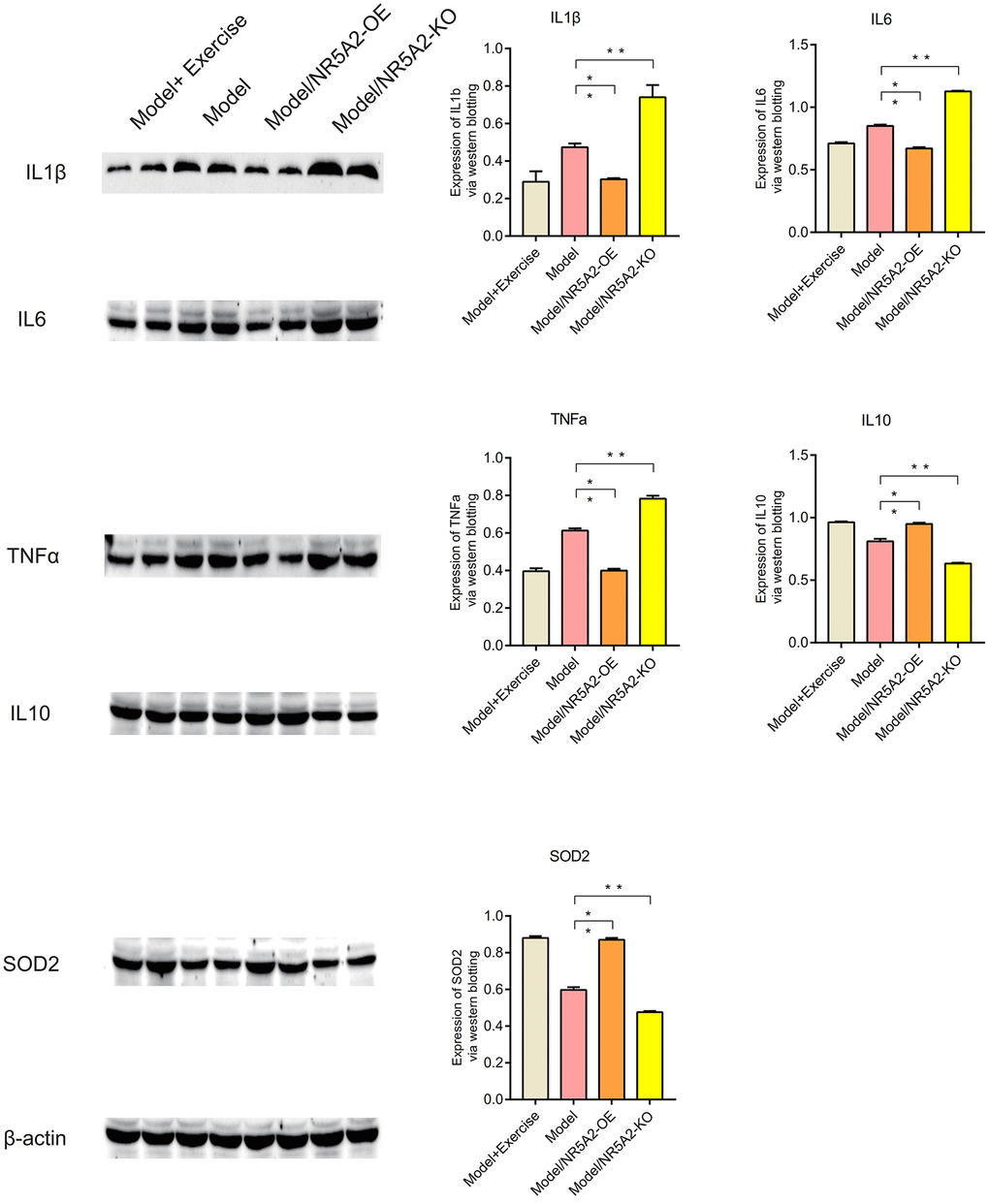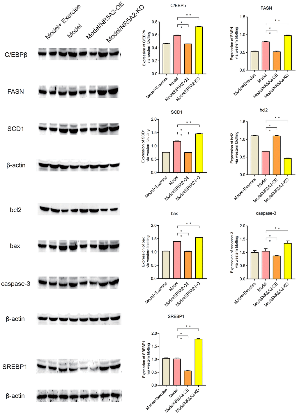 Western blot analysis showed that NR5A2, CYP7A1, and CYP8B1 were lowly expressed in metabolic syndrome, and their expression levels were up-regulated after exercise (P < 0.05) (Figure 10). IL1β, IL6 and TNFa are highly expressed in metabolic syndrome, and their expression levels are down-regulated after exercise. IL10 and SOD2 were lowly expressed in metabolic syndrome, and their expression levels were up-regulated after exercise (P < 0.05) (Figure 11). C/EBPb, FASN, SCD1, Bax and Caspase-3 were highly expressed in metabolic syndrome, and their expression levels were down-regulated after exercise. Bcl2 was low expressed in metabolic syndrome, and its expression level was upregulated after exercise (P < 0.05) (Figure 12).