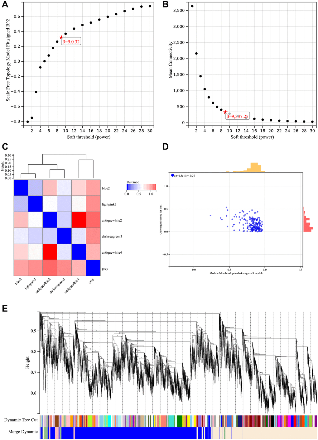 The soft threshold power was 9 (Figure 2A, 2B). Hierarchical clustering trees were constructed and six modules were presented (Figure 2C). Dendrograms and heatmaps of genes showed no significant differences in interactions between different modules, indicating a high degree of independence between these modules (Figure 2E). The Darkseagreen3 module was most negatively correlated with the status of the exertional metabolic syndrome (Figure 2D). In addition, we calculated the module characteristic vector correlation with the expression of genes for MM, by tagging based on MM (|MM| > 0.8), a total of 147 genes was identified as gene and clinical representation is closely related to the core.
