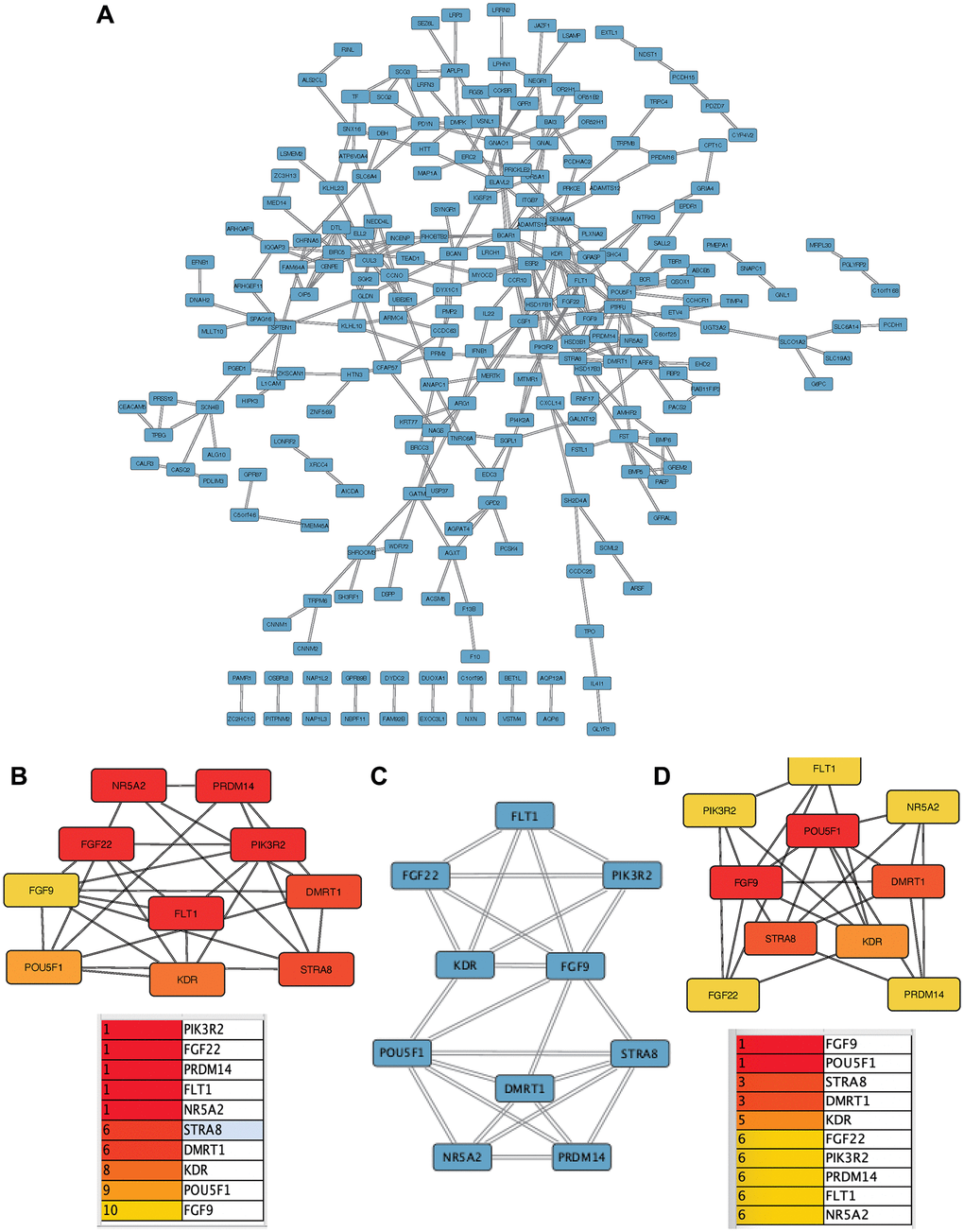 349 predicted DEGs were identified in the PPI network (Figure 3A). Hub genes were identified by the MCC algorithm (Figure 3B). We used MCODE to calculate the core module (Figure 3C). Hub genes were identified by the DMNC algorithm (Figure 3D). A total of 10 core genes (PIK3R2, STRA8, FLT1, DMRT1, FGF22, NR5A2, FLT, PRDM14, POU5F1, KDR) were obtained.