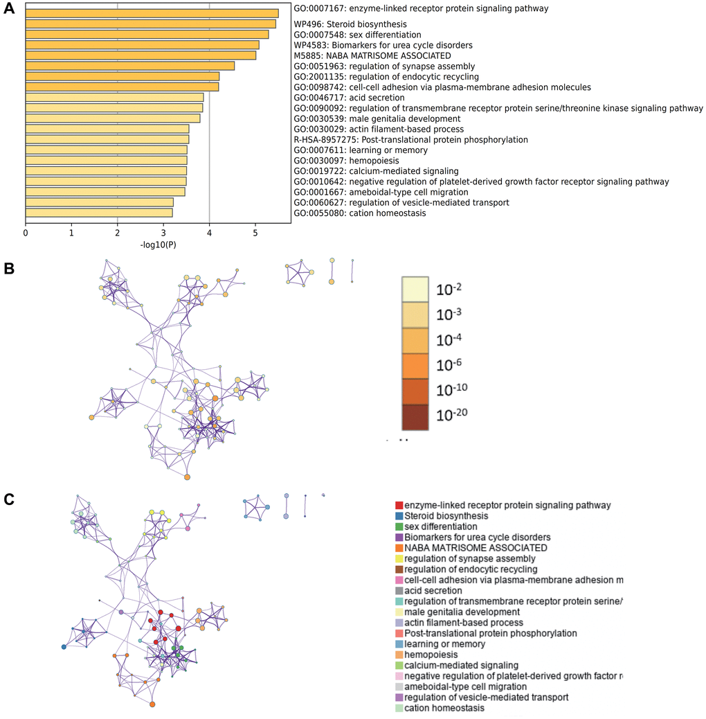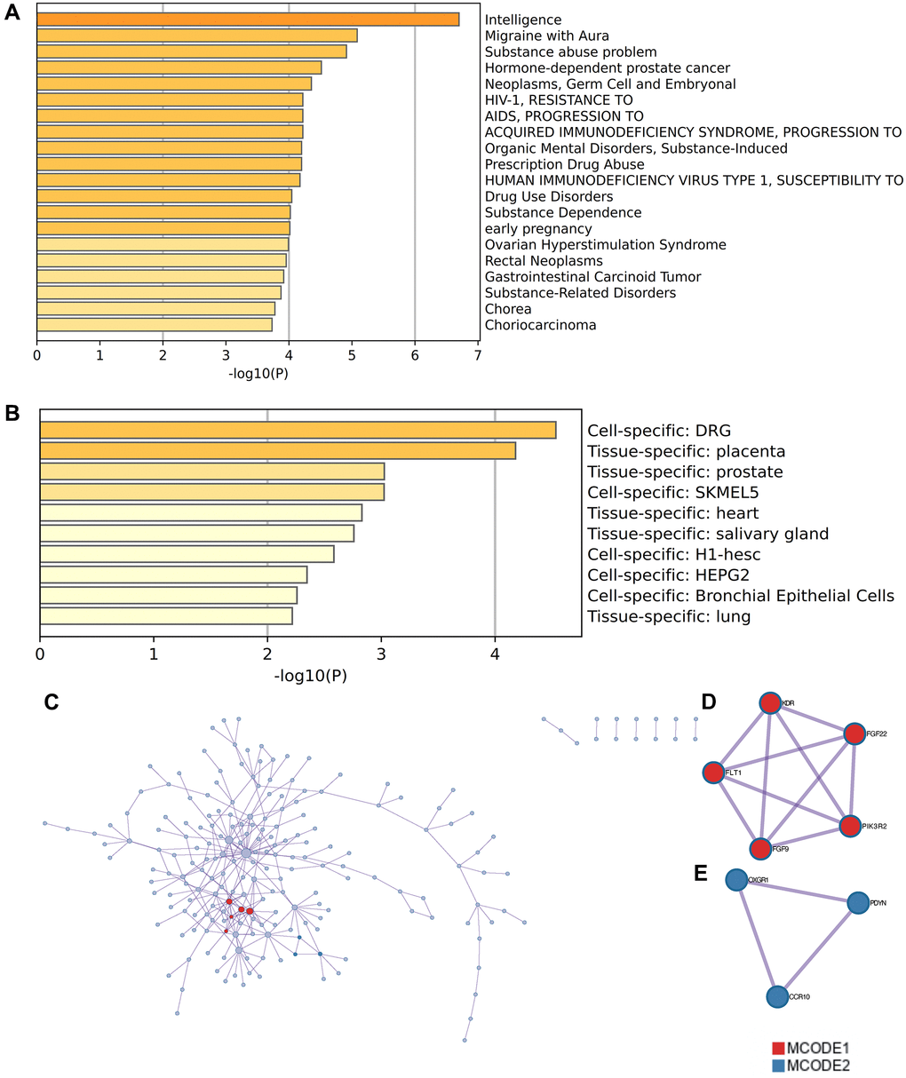 The content enriched by Metascape included GO enrichment terms (Figure 5A) and had enrichment networks colored by enrichment terms and p-values (Figure 5B, 5C). It also includes a module for enriching disease terms (Figure 6A), an enrichment term for enriching cell types (Figure 6B), and a PPI network and core module formed in Metascape website based on core genes (Figure 6C–6E).