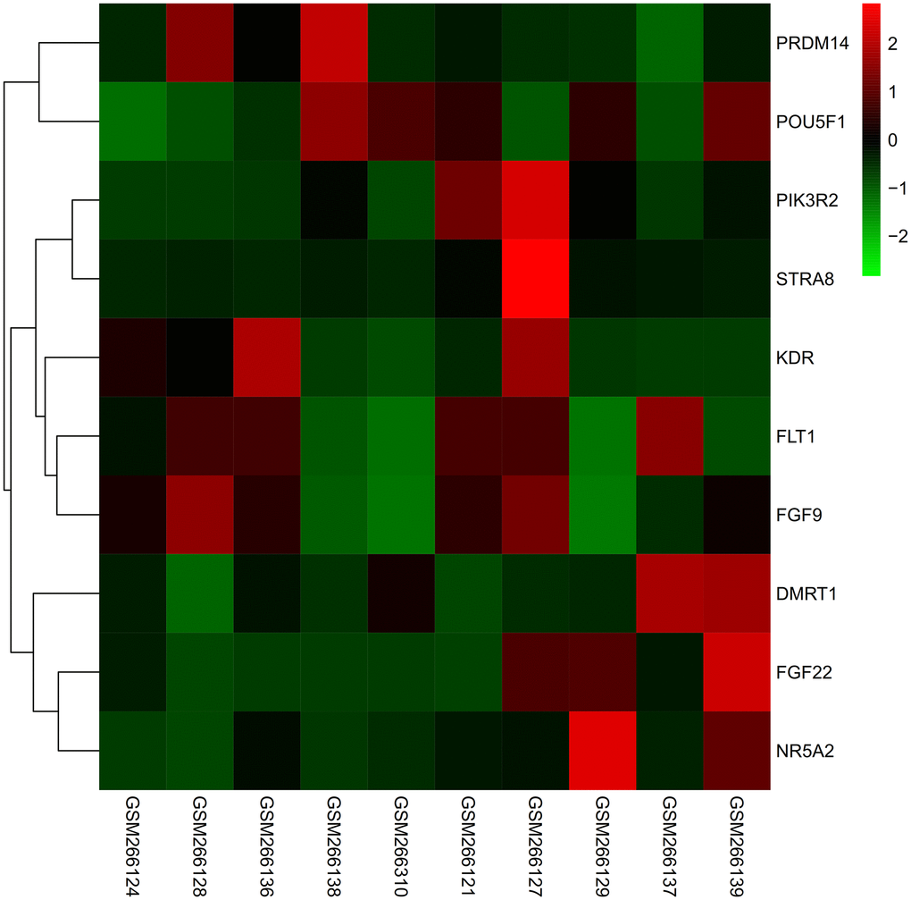 The expression of core genes in GSE10540 matrix was processed by heat map. PIK3R2, STRA8, FLT1, DMRT1, FGF22, NR5A2, and FLT genes were up-regulated in metabolic syndrome after exercise. PRDM14, POU5F1, and KDR were down-regulated after exercise (Figure 9).