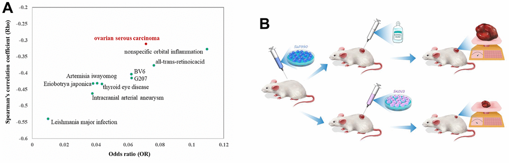 We screened the candidate agents whose gene signatures are anti-correlated with that of pancreatic cancer using DrugMine. As a result, Figure 1A shows the top ten agents with most significant odds ratio (OR) value by Fisher’s exact test and most significant Spearman’s correlation coefficient (Rho). The p-values of both tests for all agents are almost zero, indicating that the agents- induced gene expression changes are significantly anti-correlated with that of pancreatic cancer, and further suggests that these agents could defend pancreatic cancer. Moreover, strikingly, we noted that ovarian serous carcinoma is among the top ten agents, indicating that it is anti-correlated with pancreatic cancer in gene expression changes. It is well known that cancers mostly share common pathways and mechanisms during their formation and development. However, here clear discrepancy was revealed between ovarian serous carcinoma and pancreatic cancer. This finding hinted that the opposite mechanisms could exist between the two cancers and thus suggested possible novel therapeutics, that is, killing pancreatic cancer with ovarian cancer cells. Based on the above observation, we proposed novel therapeutics for pancreatic cancer treatment as shown in Figure 1B, that is, injection of ovarian cancer cells into pancreatic tumor could inhibit pancreatic cancer.