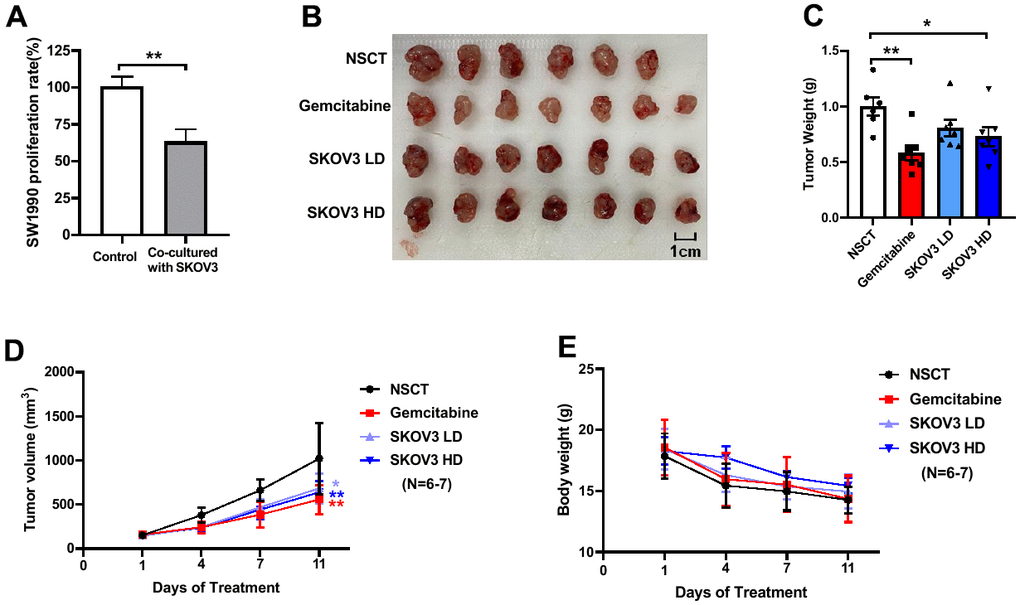 To confirm whether SKOV3 cells can inhibit pancreatic cancer in vivo, we first established subcutaneous pancreatic cancer xenografts by subcutaneous injection of SW1990 cells, then followed by intervention with low dose (LD, 3×105 cells) or high dose (HD, 6×105 cells) SKOV3 cells twice a week through intratumoral injection. Equivalent normal saline solution (NSCT) was given twice a week by intratumoral injection as blank control. Gemcitabine was used as a positive control in the intervention group (100mg/kg, twice a week by intraperitoneal injection). The mice were euthanized and the tumors were harvested after 11 days of intervention (Figure 2B). When compared with the NSCT group, we found a significant decrease of tumor weight in Gemcitabine group and the SKOV3 HD group after 11 days of treatment (Figure 2C, Gemcitabine vs. NSCT, p-value = 0.0015; SKOV3 HD vs. NSCT, p-value = 0.0278, one-way ANOVA test). When compared with the NSCT group, we found a dramatically decreased tumor volume in the Gemcitabine group, SKOV3 LD group and the SKOV3 HD group after 11 days of treatment (Figure 2D, Gemcitabine vs. NSCT, p-value = 0.0022; SKOV3 HD vs. NSCT, p-value = 0.0098; SKOV3 LD vs. NSCT, p-value = 0.0211, one-way ANOVA test). Not only that, the tumor volume was detected on the 4th and 7th day after treatment, which was significantly reduced compared with the NSCT group (Supplementary File 1). In addition, there was no significant difference in body weight change among the four groups (Figure 2E), but there was a tendency in slowing body weight loss in the SKOV3 HD group. The above results suggest that the ovarian cancer cell indeed can inhibit the growth of pancreatic tumors in vivo.