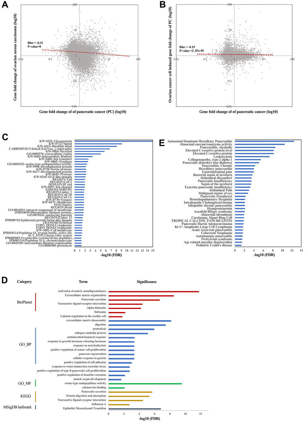 Given that the pancreas-related disease including pancreatitis is the top term related with the DEGs, it will be interesting whether the DEGs contribute to these phenotypes through inflammation or immune related functions and pathways. For doing so, we performed functions and pathways analysis (Figure 3D). Strikingly, biological processes such as protein digestion and absorption, proteolysis, response to growth hormone-releasing hormone, pancreas regeneration, positive regulation of cell adhesion, and positive regulation of type B pancreatic cell proliferation were mostly significant, suggesting that the CCC therapeutics could work by enhancing pancreas function, pancreas regeneration and cell adhesion through secreting signaling molecules to trigger proteolysis but not through inflammation and immune related functions and pathways. Moreover, molecular function (MF) analysis showed that the proteolysis could be mediated by serine-type endopeptidase but not other peptidase. Interestingly, the only significant term in MSigDB hallmark category is ‘Epithelial Mesenchymal Transition’ (EMT, FDR = 1.55e-7), suggesting that another possible mechanism of the CCC therapeutics is that the ovarian cancer cell could block the metastasis of pancreatic cancer by inhibiting its EMT process. Specifically, immune-related functional or pathway terms are not identified as significant, suggesting that the CCC therapeutics could not belong to immunotherapy.