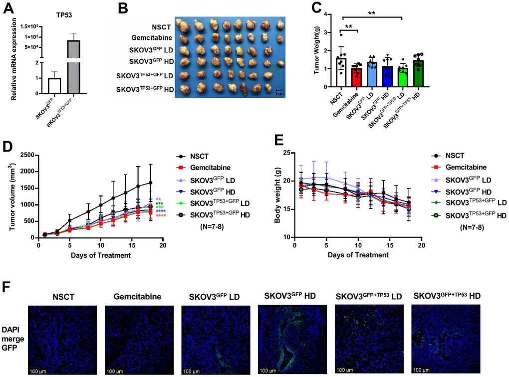 Similar to the work flow of the previous animal experiments, we upped the dose and frequency of cell injection, and followed by intervention with low dose (LD, 6×105 cells) or high dose (HD, 1.2×106 cells) SKOV3GFP or SKOV3TP53+GFP cells every two days through intratumoral injection. As shown in Figure 4B, the mice were euthanized and the tumors were harvested after 18 days of intervention. As a result, the tumor weight in the Gemcitabine group and SKOV3TP53+GFP LD group had a significant decrease (Figure 4C, Gemcitabine group vs. NSCT, p-value = 0.016; SKOV3TP53+GFP LD vs. NSCT, p-value = 0.025, one-way ANOVA test). Comparing with the NSCT group, xenograft tumors grown in both the SKOV3GFP group and the SKOV3TP53+GFP group of low dose or high dose had a smaller mean size (Figure 4D). The tumor volume was significantly smaller and significantly different from the NSCT group at each measurement after intervention. Furthermore, there was no significant difference in body weight change among the four groups (Figure 4E), but, early in the intervention, treatment with SKOV3GFP or SKOV3TP53+GFP cells can slow down the weight loss. In addition, as SKOV3 is also a rapidly proliferating cancer cell, we were concerned that the injected SKOV3 cells might develop into ovarian cancer in the pancreatic tumor. Therefore, we observed the green fluorescence under confocal microscope after frozen section of xenograft tumor. The result showed that no ovarian cancer was formed in the pancreatic tumor after SKOV3GFP and SKOV3TP53+GFP injection, but only some scattered GFP fluorescence signals were detected (Figure 4F). The above results indicate that the CCC therapeutics combined with genetic engineering may further enhance the treatment effect.