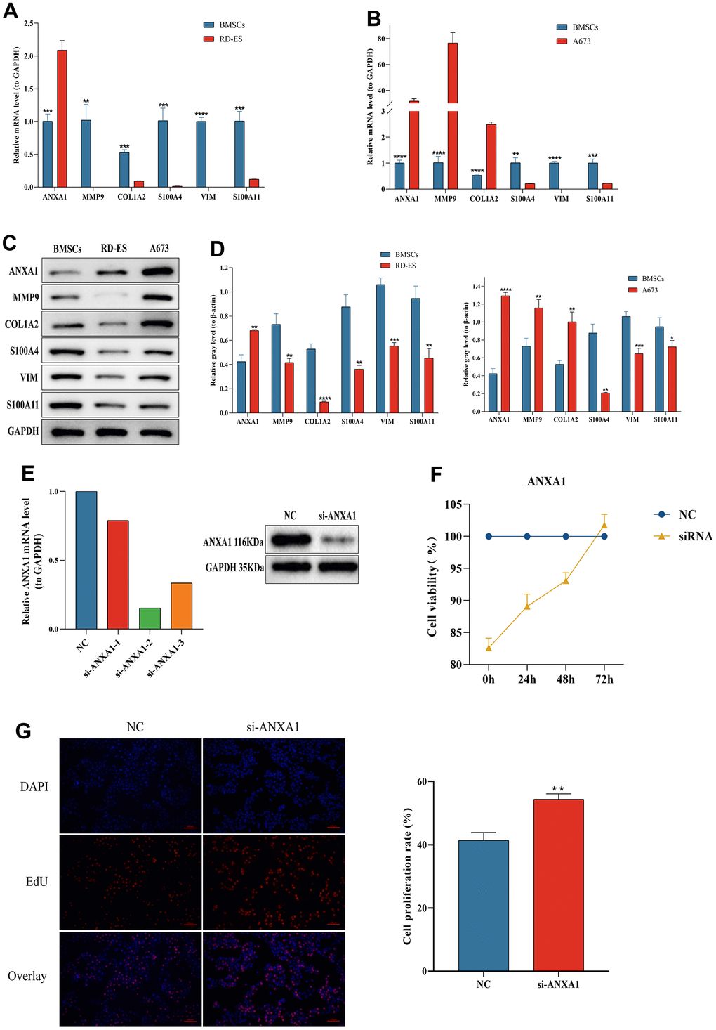 The RT-qPCR results showed that six hub genes, including ANXA1, were significantly differentially expressed in either RD-ES cells or A673 cells (Figure 10A). The relative expression levels of ANXA1 were significantly higher in RD-ES cells than in MSCs, while the relative expression levels of MMP9, COL1A2, S100A4, VIM and S100A11 were significantly lower than in MSCs. The relative expression levels of ANXA1, MMP9 and COL1A2 were significantly higher in A673 cells, while the relative expression levels of S100A4, VIM and S100A11 were significantly lower than those in MSCs (Figure 10B). Subsequent Western blot analysis verified that the protein levels of the six hub genes were all significantly differentially expressed in either RD-ES cells or A673 cells (Figure 10C). The expression of ANXA1 increased in ED-ES and A673 cells, while the expression of MMP9, COL1A2, S100A4, VIM and S100A11 decreased in ED-ES cells. It is worth mentioning that the protein levels of ANXA1, MMP9 and COL1A2 were significantly increased in A673 cells, while the protein levels of S100A4, VIM and S100A11 were significantly decreased in A673 cells, which was consistent with the results of RT-qPCR (Figure 10D).