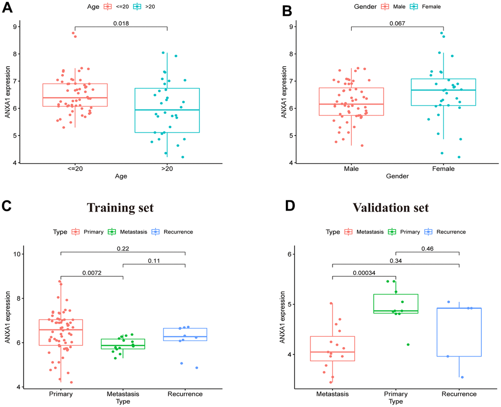 After dividing the clinical characteristics into specific subgroups, we analyzed the expression of ANXA1 in a clinical subgroup from the GSE17679 dataset. In the subgroup of age, the median expression of ANXA1 in the ≤20-year-old group was higher than that in the >20-year-old group (P=0.018) (Figure 2A). In the gender subgroup, there was no significant difference in ANXA1 expression levels between male and female patients (P>0.05) (Figure 2B). In the subgroup of tumor status, the median expression of ANXA1 in the metastasis ES group was significantly lower than that in the primary ES group (P=0.0072), but there was no significant difference between the primary group and recurrence group (P>0.05) (Figure 2C). Additionally, 22 ES patients from combined the GSE45544 and GSE73166 datasets were used to verify the age, gender and tumor status of the subgroup, and the results showed that the median expression of ANXA1 in the metastasis ES group was significantly lower than that in the primary ES group (P=0.00034) (Figure 2D).