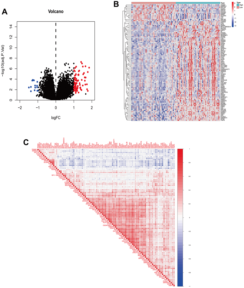 Based on the median expression level of the hub gene, ES samples were divided into high and low expression groups. DEGs were screened using the “limma” package, and the concentrated area of upregulated or downregulated genes was indicated by a volcano plot and heatmap. The screening criteria were an absolute value of |logFC| > 1 and an adjusted P value < 0.05. To explore the relationship between the hub gene and DEGs, a significant P value was obtained by correlation test. Further visualization was performed in the form of a heatmap and correlation coefficient heatmap using the “corrplot” package.