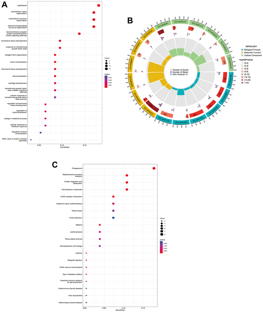 A total of 95 DEGs were identified, of which 81 were upregulated genes and 14 were downregulated genes. The visual volcano plot and heatmap showed that the high-expression genes and the low-expression genes could be clearly distinguished according to the median expression of ANXA1 (Figure 3A, 3B). Further analysis of the correlation between ANXA1 and DEGs showed that 81 genes were positively correlated with ANXA1, and 14 genes were negatively correlated with ANXA1 (Figure 3C). In GO enrichment analysis (Figure 4A, 4B), DEGs were mainly involved in biological processes (BPs) such as the formation of extracellular matrix organization (16 genes), formation of extracellular structure organization (16 genes), ossification (17 genes), formation of external encapsulating structure organization (16 genes), and formation of collagen fibril organization (8 genes). In cellular components (CCs), DEGs were mainly involved in collagen-containing extracellular matrix (36 genes), collagen trimer (10 genes), fibrillar collagen trimer (4 genes), banded collagen fibril (4 genes), and basement membrane (7 genes). In terms of molecular functions (MFs), DEGs were significantly involved in extracellular matrix structural constituent (26 genes), collagen binding (10 genes), integrin binding (11 genes), extracellular matrix structural constituent conferring tensile strength (6 genes), and extracellular matrix structural constituent conferring compression resistance (5 genes). Additionally, the enrichment results of the KEGG pathway analysis showed that DEGs were related to phagosomes (8 genes), Staphylococcus aureus infection (6 genes), and protein digestion and absorption (6 genes) (Figure 4C). The top 5 pathways are listed in Table 1.