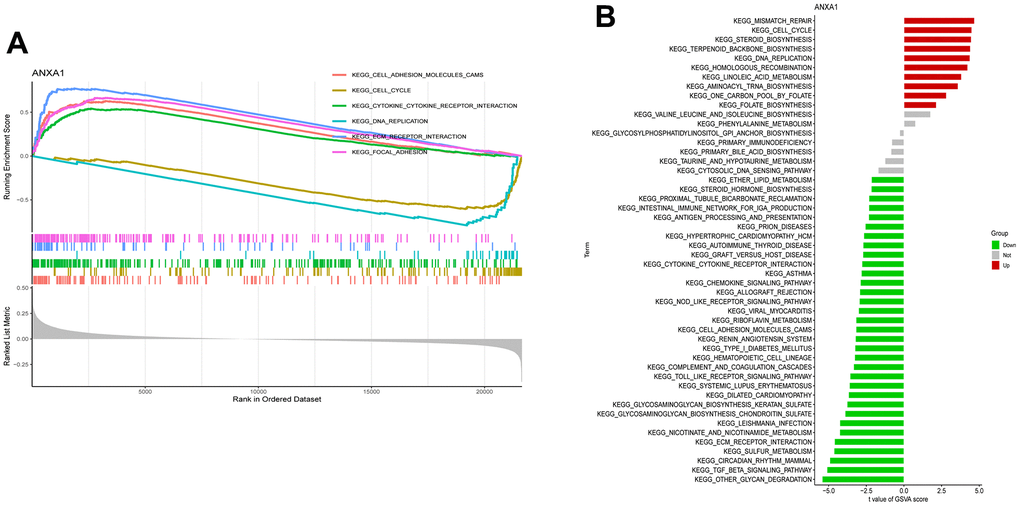 To further identify the expression differences in the involved KEGG pathways, GSEA and GSVA enrichment analyses revealed that ANXA1 was involved in the cell adhesion molecules cams, cell cycle, cytokine-cytokine receptor interaction, DNA replication, ECM receptor interaction and focal adhesion pathways (Figure 5A, 5B).
