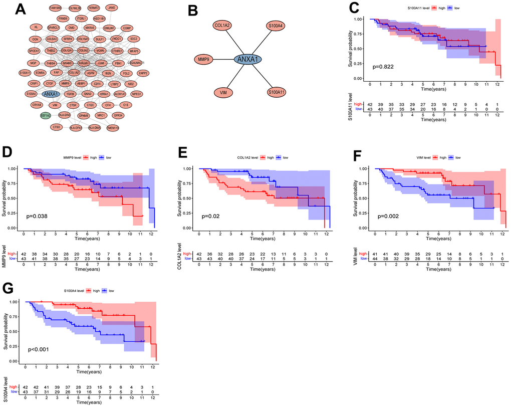 First, a total of 64 genes were screened by Cox regression analysis of patients with ES based on OS time and survival status (P<0.001) (Supplementary Table 1). Next, 50 genes were further obtained from 88 samples screened by survival analysis according to OS time and survival status (P<0.001) (Supplementary Table 2). Finally, 374 genes were significantly associated with at least one clinical characteristic through clinical correlation analysis, of which 50 genes were significantly associated with two clinical features, and 324 genes were significantly associated with only one clinical feature (Supplementary Table 3). Based on survival (P<0.001), independent prognostic (P<0.001), and clinical correlation analyses (SigNum=2), ANXA1 was determined to be the final hub gene.