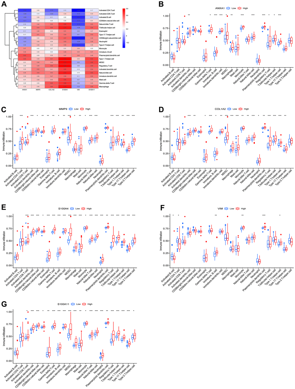 To explore the relationship between the 23 immune cells and the hub genes, a correlation heatmap was constructed (Figure 7A) and it suggested that 5 target genes other than the VIM gene had a strong correlation with 23 immune cells. Specifically, ANXA1, COL1A2, MMP9, S100A4 and S100A11 high-expression groups were associated with high infiltration of activated dendritic cells, gamma delta T cells, immature B cells, immature dendritic cells, MDSCs, macrophages, natural killer cells, regulatory T cells, T follicular helper cells, and type 1 T helper cells (Figure 7B–7G).