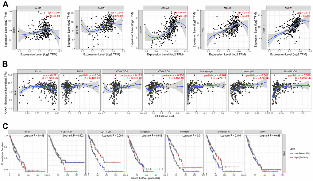 Previous studies have shown that tumor tissues contain tumor cells and lymphocytes, and TILs can predict the survival status of tumor patients [17, 18]. To further investigate the correlation between the expression levels of ANXA1 and TILs, we explored the correlation between the expression levels of ANXA1 and the infiltrating abundance of TILs in sarcoma patients through the TIMER database. In sarcoma, the expression levels of ANXA1 were positively correlated with those of MMP9 (r=0.204, P=9.43e-04), COL1A2 (r=0.349, p=8.87e-09), S100A4 (r=0.574, P<0.001), VIM (r=0.48, P<0.001) and S100A11 (r=0.638, P<0.001) (Figure 8A).