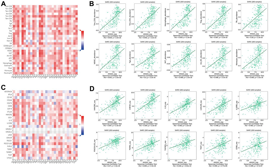 Next, we explored the correlation between the expression levels of ANXA1 and immune cells through the TISIDB database. Figure 9A shows a heatmap of correlation between the expression levels of ANXA1 and TILs in different types of tumors. In 263 sarcoma patients, the expression levels of ANXA1 were significantly correlated with the infiltration abundance of 26 TILs, with the strongest correlation with tcm_CD8, tcm_CD4, macrophage, treg, tfh, MDSC, tgd, NKT, act_DC and monocyte (Figure 9B and Supplementary Figure 2).