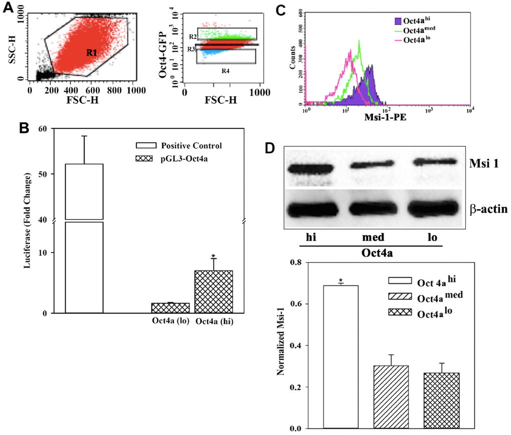 Msi 1 facilitated BCC growth, chemoresistance, and likely support CSCs [4, 8]. Previous studies have identified dormant BCCs in the bone marrow as CSCs [24]. Thus, an understanding of how Msi 1 regulates CSCs will contribute to the mechanisms by which BCCs survive as dormant cells in the bone marrow niche [23, 24]. We took advantage of our established model to discern different subsets of MDA-MB-231 with stable pOct4a-GFP. The intensity of GFP correlated with Oct4a levels with the subsets showing the highest GFP intensity as CSCs (Oct4ahi) [23, 24, 31] (Figure 1A). We further validated the correlation between GFP intensity and Oct4a expression using reporter gene studies. We transfected pOct4a-Luc into Oct4ahi and Oct4alo BCCs. Technical control used MDA-MB-231 cells, transfected with pGL3-Luc under the control of CMV promoter [36]. Luciferase level was significantly (p<0.05) reduce in Oct4alo BCCs as compared to Oct4ahi BCCs, indicating that Oct4a levels could be assessed with GFP intensity (Figure 1B).