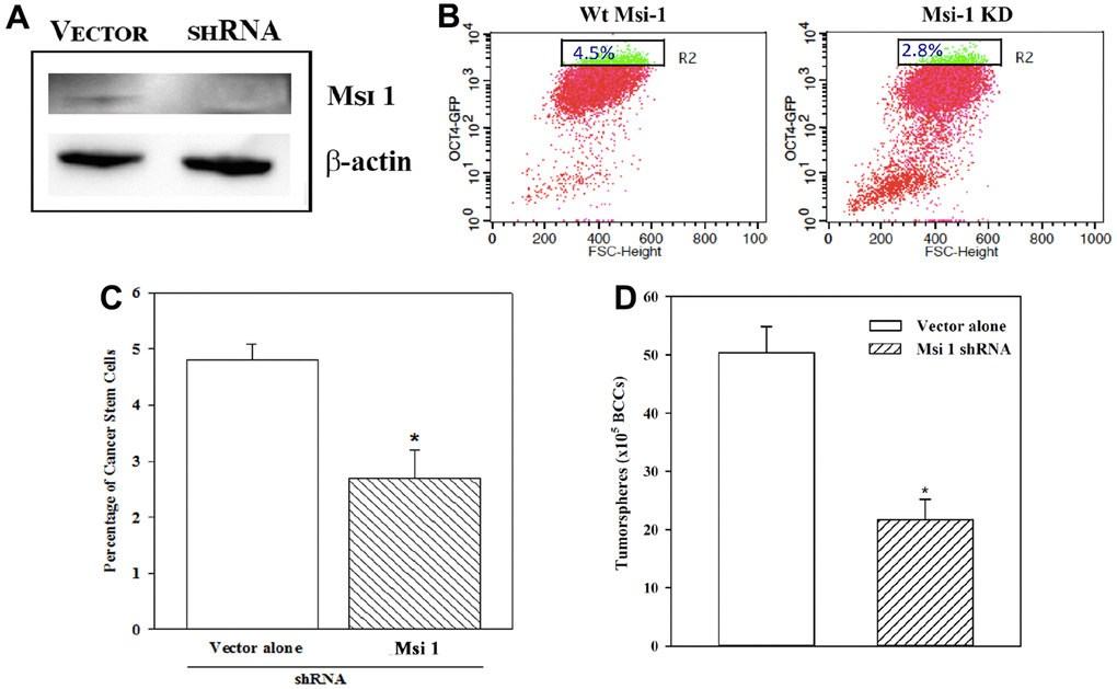 In this section, we describe a functional role for Msi 1 in CSC maintenance [8]. We knocked down Msi 1 in BCCs and then evaluated the percentage of CSCs, relative to vector transfectants. The latter comprised cells with the basic Msi 1 shRNA vector. Western showed a bright band for Msi 1 in the vector transfectants and a faint band when Msi 1 was knockdown, which validated its decrease (Figure 2A). Since Msi 1 knockdown BCCs stably expressed pOct4a-GFP, we applied GFP intensity to assess the percentage of Oct4ahi cells. Flow cytometry indicated a marked decrease of Oct4ahi BCCs in the Msi 1 knockdown cells as compared to vector transfectants (Figure 2B). A summary of biological and technical replicates indicated a significant (p<0.05) decrease of Oct4ahi BCCs/CSCs in Msi 1 knockdown BCCs, as compared to vector transfectants (Figure 2C). These findings supported a functional role for Msi 1 in CSC maintenance.