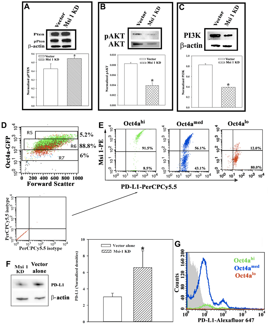 Triple negative BCCs express high levels of the T-cell inhibitory molecule, PD-L1, which is a target for immune checkpoint inhibitors [25]. PD-L1 expression on triple negative BCCs depended on decreased PTEN and increased PI3K [25]. However, we noted an increase in p-PTEN in Msi 1 knockdown cells with concomitant decreases in p-AKT and PI3K (Figures 5A–5C). We first examined wild-type BCCs for PD-L1 expression. We used the gating scheme shown in Figure 5D to analyze different BCCs for Msi 1 and PD-L1. The voltage used to isolate BCC subset has been consistent and therefore served as an internal control [24]. Thus, if a particular subset seems higher, this is due to the total number of events since the relative percentages of cells remain consistent with the literature [24]. Both proteins were expressed in Oct4ahi BCCs, which are predominantly CSCs (Figure 5E- left panel, upper right quadrant). We also noted a small subset within the Oct4ahi BCCs that express PD-L1 but were negative for Msi 1 (lower right quadrant). This pattern was similar for Oct4amed BCCs, except for a higher subset expressing only PD-L1 (Figure 5E, middle panel). In contrast, the majority of Oct4alo BCCs express PD-L1 alone (Figure 5E, right panel). In summary, most of Oct4ahi/CSCs co-expressed PD-L1 and Msi-1 whereas the less mature BCC subsets mostly express PD-L1 alone, but do not coexpress Msi-1.