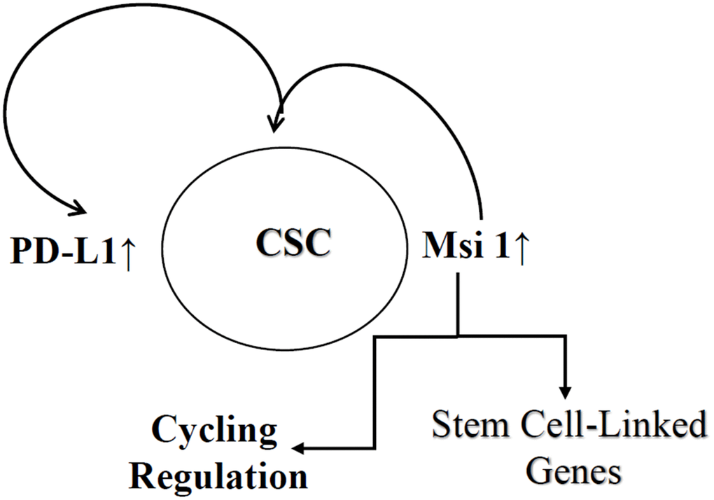 We validated the link between Msi 1 and PD-L1 in CSCs based on significant reduction of CSCs following Msi 1 knockdown. This study has just begun to study this link, which is fundamental to the treatment of CSCs, perhaps by combining immune therapy with other treatments. CSCs are difficult to treat due to increased drug resistance genes and cycling quiescence. Thus, other avenues of treatment are necessary. The stem cell genes such as BMI and Notch have failed to have an impact on solid tumors. This could be due to the dose limit of drugs, which could be toxic to the endogenous stem cells. This is particularly relevant to bone marrow, which is the home of hematopoietic stem cells.